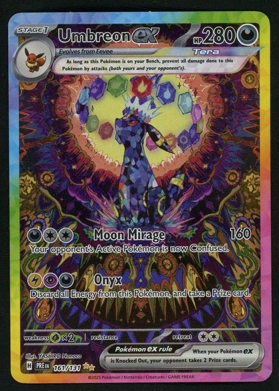 This 2023 Pokemon Paldea Evolved Umbreon ex card is a prized possession for any serious Pokemon card collector. As one of the most powerful and popular Eeveelutions, Umbreon ex holds a significant place in the Pokemon universe. The card's prominent number (193/193) also adds to its allure, signifying it as a key card within the Paldea Evolved set. Its powerful moves and striking artwork make it a standout piece in any collection. Whether you're a seasoned collector or a fan of Umbreon, this card is a must-have.