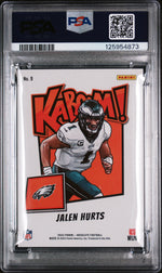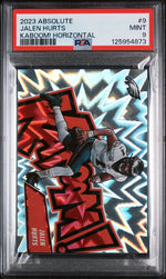 Feast your eyes on this stunning 2023 Panini Absolute #9 card, featuring the dynamo himself, Jalen Hurts of the Philadelphia Eagles. As a standout piece from the coveted 'Kaboom!' insert set, this card is a must-have for any serious collector.