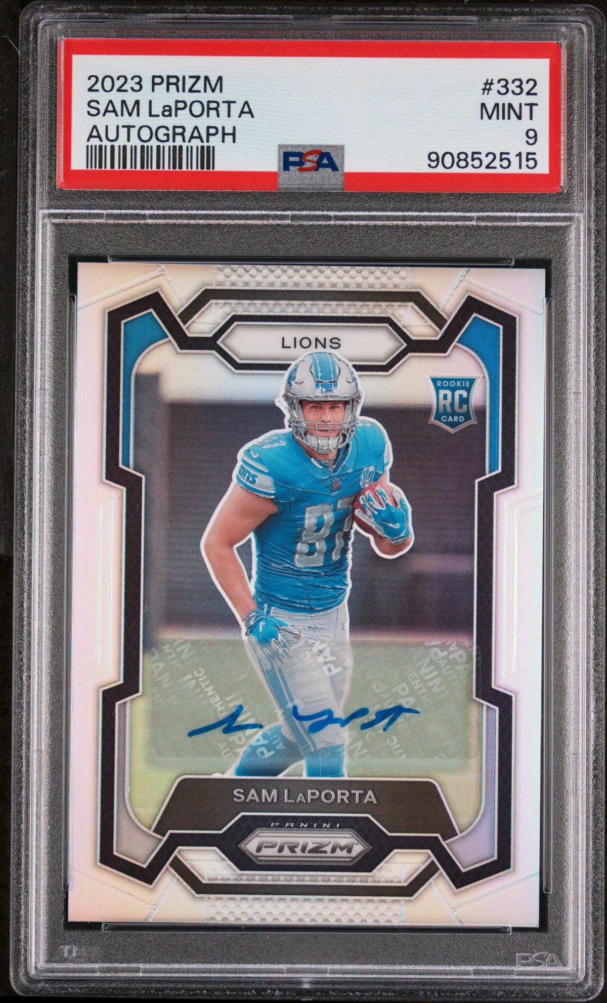 Unveil the glory of your sports card collection with this exquisite 2023 Panini Prizm card featuring the remarkable NFL player, Sam LaPorta. This card, straight from the 2023 Prizm set, carries the illustrious card number 332 and showcases the dynamic strength and talent of Sam LaPorta, a shining star of the Lions team. What sets this card apart is the stunning autograph of LaPorta himself, an unmistakable mark of authenticity that adds immense value to this piece. As a testament to its pristine condition, this card has been professionally graded by PSA and proudly sports a numeric grade of 9, which translates to a 'Mint' condition. This card is not just a piece of memorabilia; it's a symbol of LaPorta's rookie year, making it a priceless gem for any sports card enthusiast. Adding to its allure, this card is a part of the Panini Prizm brand, a name synonymous with high-quality sports card manufacturing. The key features of this card include its autograph, rookie status, PSA 9 Mint grading, and association with the 2023 Panini Prizm set, NFL, and the Lions team. This card is not just a purchase; it's an investment. It's a tangible piece of sports history that commemorates Sam LaPorta's spectacular journey in the NFL. Whether you're a seasoned collector or a budding enthusiast, this card is a must-have addition to your collection. Don't miss this chance to own a piece of the Lions' legacy, encapsulated in this magnificent 2023 Panini Prizm Rookie Autographed card of Sam LaPorta.