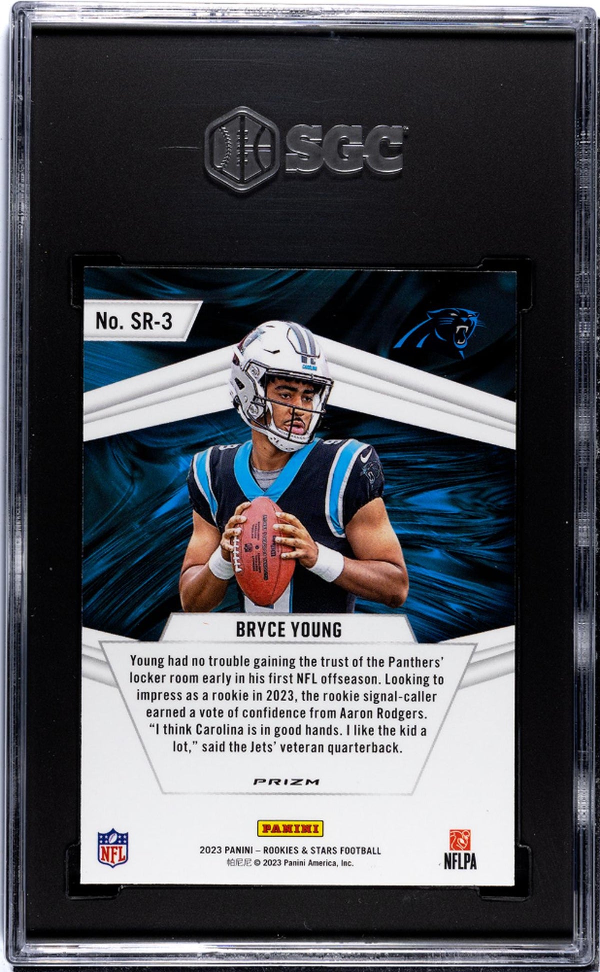 This is an unmissable piece for any NFL fan, sports card collector, or admirer of Bryce Young. Its key features, including the 2023 Panini manufacture, Bryce Young Rookie status, Stellar Rookies Insert, Longevity Prizm Parallel, and SGC Graded 9.5 rating, make it a standout piece. This card is a tangible piece of the NFL's legacy and a tribute to the early career of Bryce Young, a player that promises to leave an indelible mark on the sport.