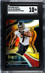 Introducing the striking 2023 Panini Select Football Card of the sensational Bijan Robinson! This gem is a must-have for any avid sports card collector or football enthusiast. The magnificent Red/Yellow Die-Cut Prizm design elevates the overall aesthetic of the card, making it a standout piece to own.