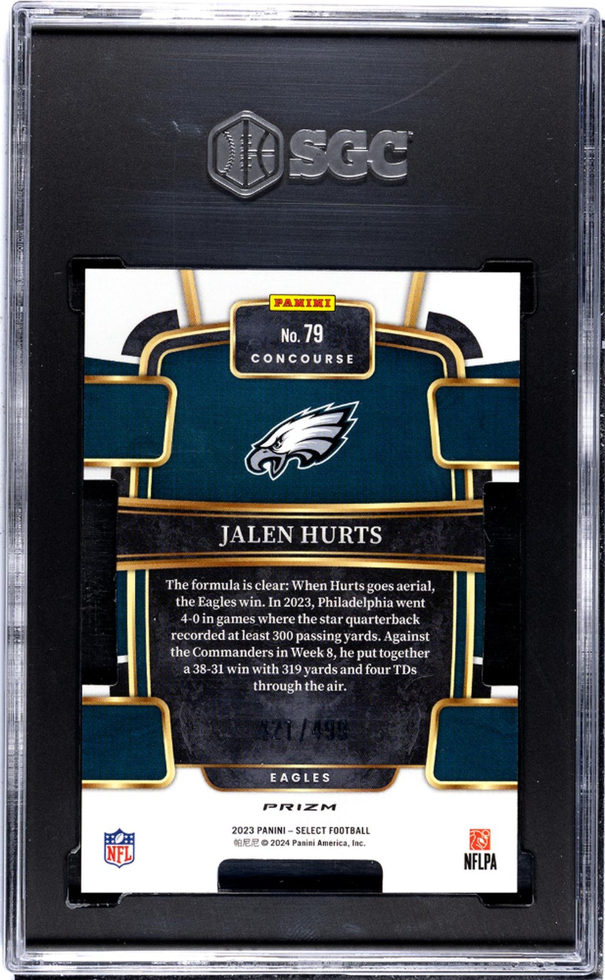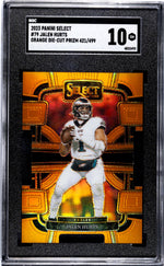 Immerse yourself in the thriving world of sports card collecting with this captivating 2023 Panini Select #79 Jalen Hurts Concourse Orange Die-Cut Prizm card. Manufactured by the esteemed sportscard brand Panini, this card is a shining testament to the dynamic prowess of NFL's Eagle's star player, Jalen Hurts.