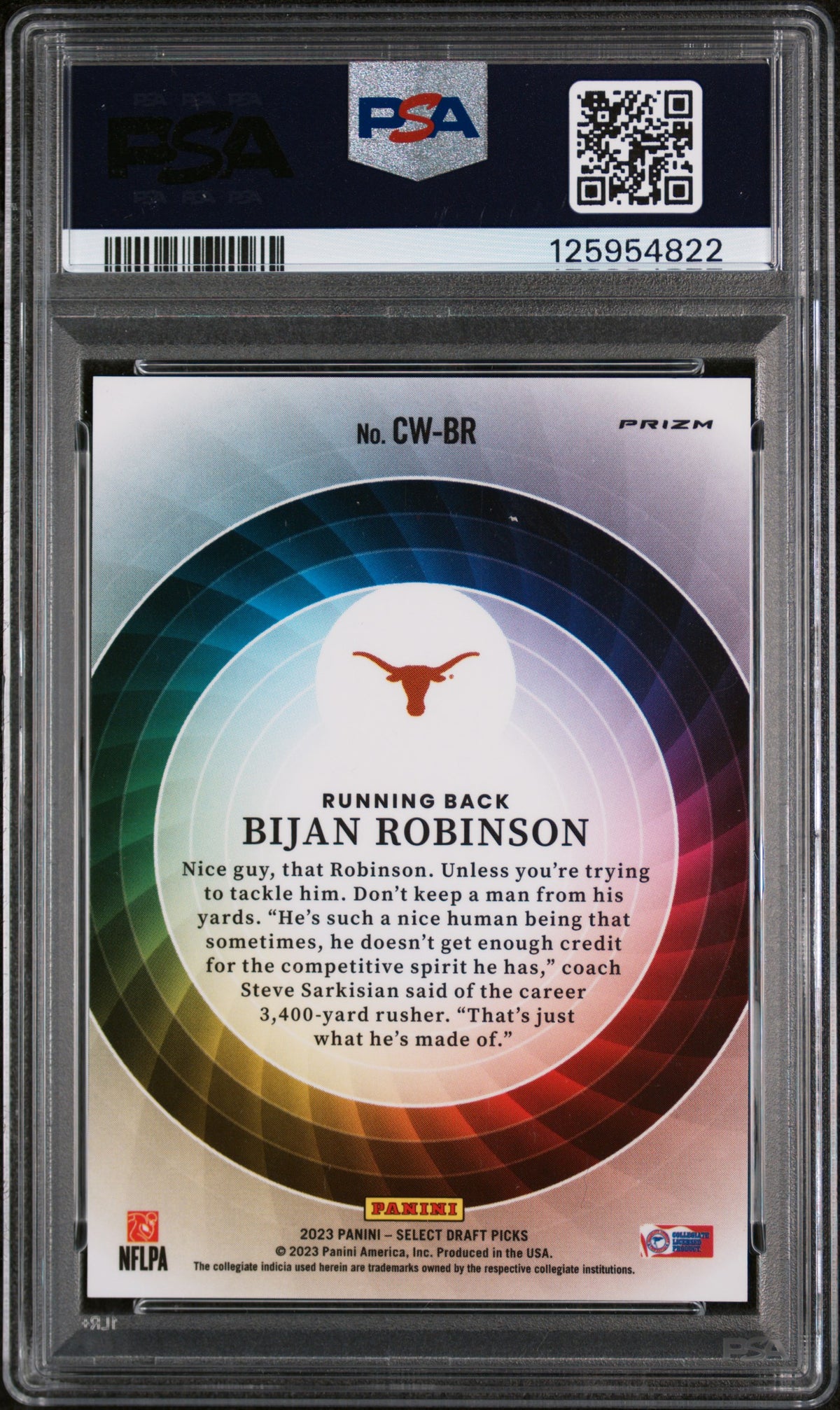 Despite its youth, the card already exudes a sense of rarity and speciality, thanks to its unique features. The key features of this card are its PSA grading, its inclusion in the Color Wheel insert, it being a Rookie card, its Prizm finish, and of course, the association with the Texas Longhorns and Bijan Robinson.