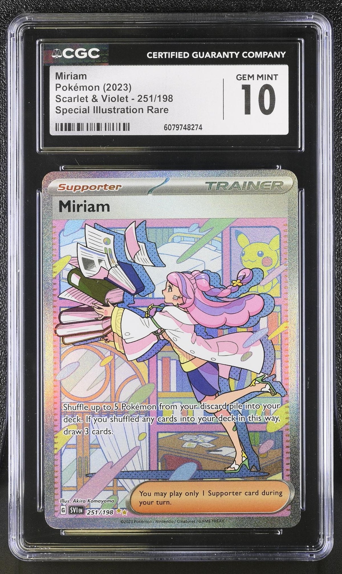 Treasure this 2023 Scarlet & Violet 251/198 Miriam card for its remarkable quality and rarity. A true gem in every sense, it's the epitome of what every collector seeks in a Pokemon card. Dive into the wonderful world of Pokemon, one card at a time!