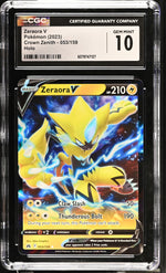 The 2023 Pokemon 053/159 Zeraora V Gem Mint card is a dazzling addition to the Pokemon Crown Zenith set. Its key features include its Gem Mint 10 condition, the coveted Crown Zenith collection, its 2023 release, the Holo finish, and of course, the Zeraora V character that it beautifully portrays.