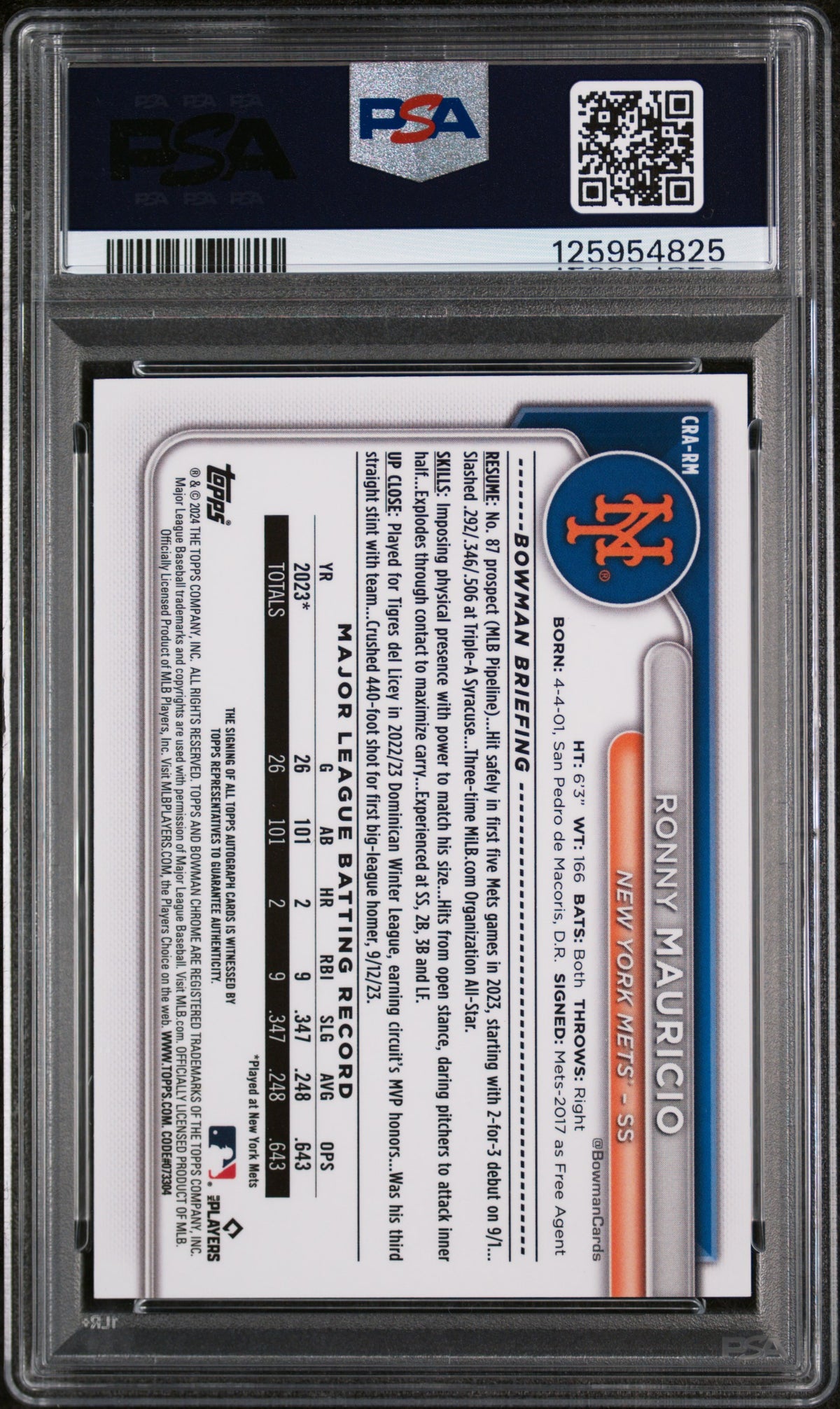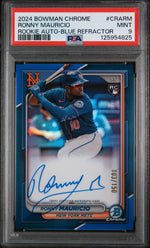 2024 Bowman Chrome Chrome Rookie Autographs Rookie Auto-Blue Refractor Ronny Mauricio #CRARM /150 PSA 9