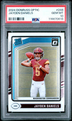 Step into the future of NFL trading cards with this magnificent, gem mint condition 2024 Donruss Optic #248 Jayden Daniels card. Produced by the renowned manufacturer, Panini, and belonging to the sought-after 'Rated Rookie' insert set, this card is a shining testament to the promising career of Jayden Daniels, the star player of Washington Commanders.