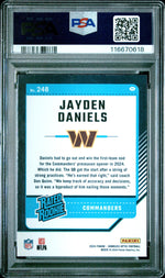 The card's key features include its 'Rated Rookie' status, signifying Daniels' remarkable debut in 2024, and its 'Gem Mint' condition, indicative of being perfectly preserved. The card also stands as a proud representation of the Washington Commanders, adding to its appeal for fans and collectors alike.