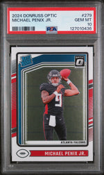 Dive into the world of football with this extraordinary sports card featuring the talented Michael Penix Jr. of the Atlanta Falcons. This is a highly coveted 2024 Donruss Optic #279 Michael Penix Jr. card, a standout piece from the esteemed 'Rated Rookie' insert set. This card is brought to you by Panini, a manufacturer synonymous with quality and prestige in the sports card arena. The brand 'Donruss Optic' is admired by collectors globally for its premium design and superior craftsmanship. Authenticity and condition are paramount in the world of card collecting, and this card hits the mark on both fronts. It is not merely a rookie card; it is a PSA-graded rookie card, indicating its superior quality and authenticity. With a numeric grade of '10' and a condition description of 'Gem Mint', this card is in pristine condition, free of any discernible flaws. As a Rated Rookie card, this piece represents a snapshot of Michael Penix Jr.'s early career, capturing the promise and potential that has since been realized on the field. This card is a must-have for any serious collector or avid fan of the Atlanta Falcons or the NFL at large. Celebrate the legacy of Michael Penix Jr. with this immaculate card. This is not just a piece of cardboard; it's a piece of history, a testament to a player's journey, and a tangible piece of the sport we all love. Add this 2024 Donruss Optic Michael Penix Jr. card to your collection today and own a piece of the NFL's rich history. Key features of this card include its status as a Rated Rookie, its association with the Atlanta Falcons, its Gem Mint 10 PSA grade, and its place in the 2024 Donruss Optic set. This card is a blend of sports history and artistry, making it a valuable addition to any collection. Don't miss out on this excellent opportunity to own a piece of football history!