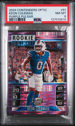 In summary, this 2024 Panini Contenders Optic #81 Keon Coleman card is a standout piece. Its Purple Pulsar parallel design, rookie status, limited serial number, and impressive PSA grade make it a highly desirable addition to any collection. Don't miss out on owning a piece of NFL history with this extraordinary card.