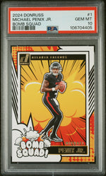 This card is not a rookie card, making it a testament to the enduring success and consistent performance of Michael Penix Jr. throughout his NFL career. Its card number '1' further amplifies its uniqueness among the Donruss Bomb Squad set.