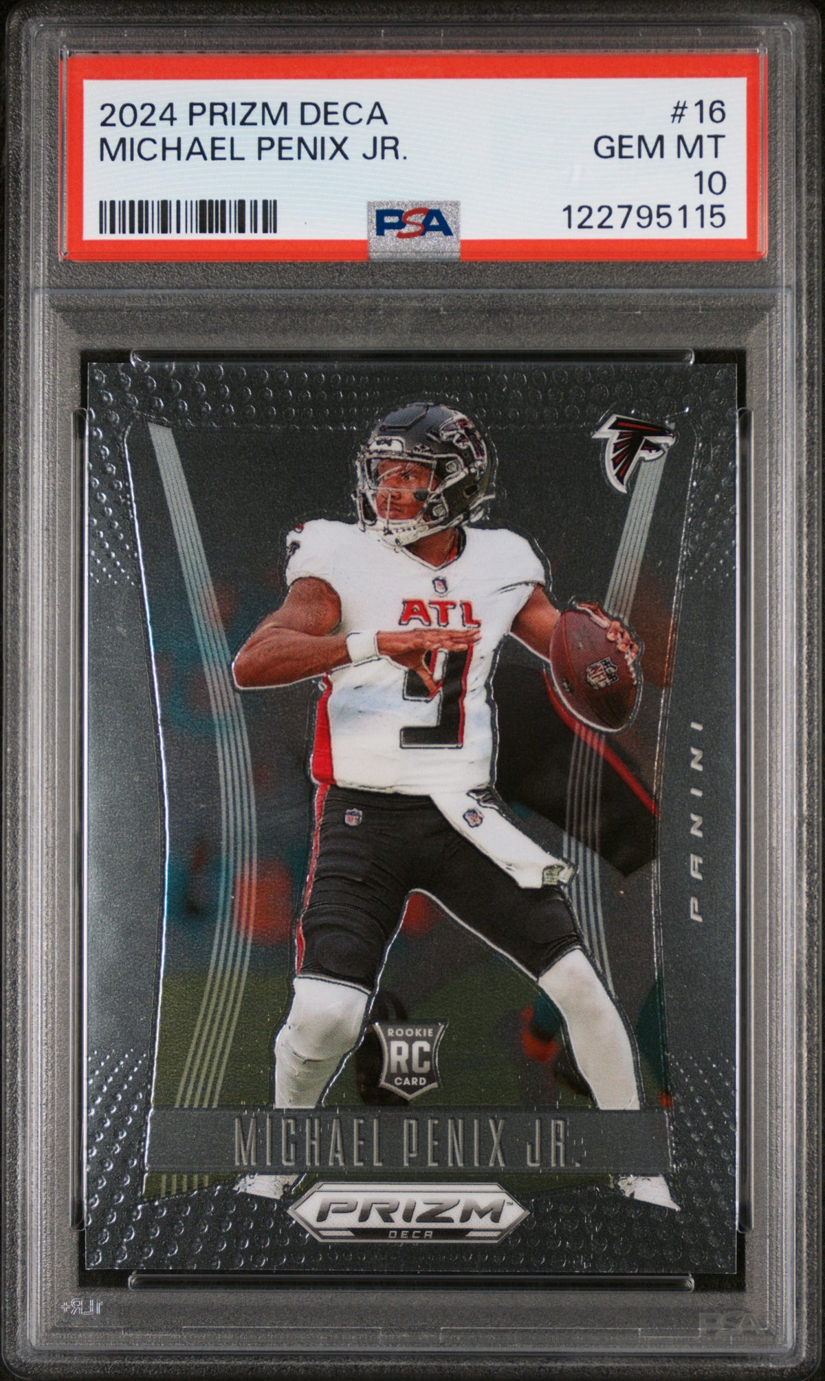 Feast your eyes on this exquisite gem: The 2024 Panini Prizm #16, featuring the electrifying rookie, Michael Penix Jr. of the Atlanta Falcons. This highly sought-after card hails from the exclusive Deca insert set, bringing a touch of rarity and uniqueness to your collection.