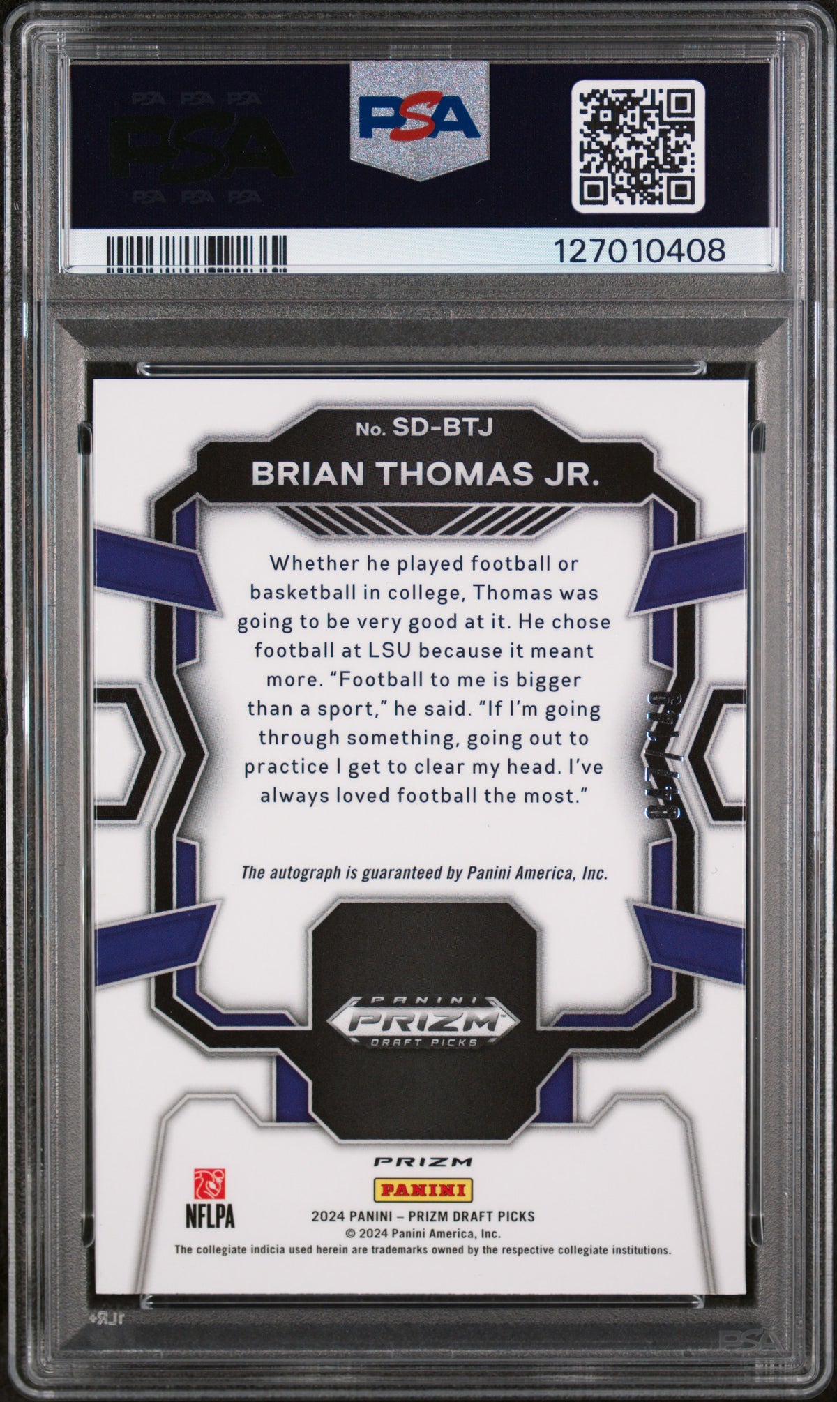 Step right up, sports collectors and NFL enthusiasts! Presenting an exemplar of sports memorabilia, the 2024 Prizm SD-BTJ Brian Thomas Jr. This is a spectacular rookie card from the renowned manufacturer, Panini, part of their esteemed Prizm Draft Picks set. Distinguished for its rarity, this card features the Signing Day insert set, making it a truly extraordinary addition to any collection. One of its most striking features is the player's signature, a testament to the authenticity and uniqueness of this collectible. Signed by the promising player Brian Thomas Jr., this autographed card is an embodiment of his budding career and bright future in the NFL. Produced in 2024, the card's allure is further elevated by its Blue Prizm parallel, enhancing its visual appeal and making it stand out in any collection. A gem in its own right, this card has been professionally graded by PSA and has received a flawless Gem Mint 10 rating, guaranteeing its impeccable condition and long-lasting value. A piece of the NFL legacy, this card is a tangible connection to the adrenaline-charged world of American football and the thrilling potential of rookie player Brian Thomas Jr. It is more than just a card; it's a piece of sports history that you can own. Whether you're a dedicated collector, an enthusiastic fan, or looking for an exceptional gift for a sports lover, this 2024 Prizm SD-BTJ Brian Thomas Jr. card is an investment in the exciting world of NFL. Don't miss the chance to make this gem the newest addition to your collection!