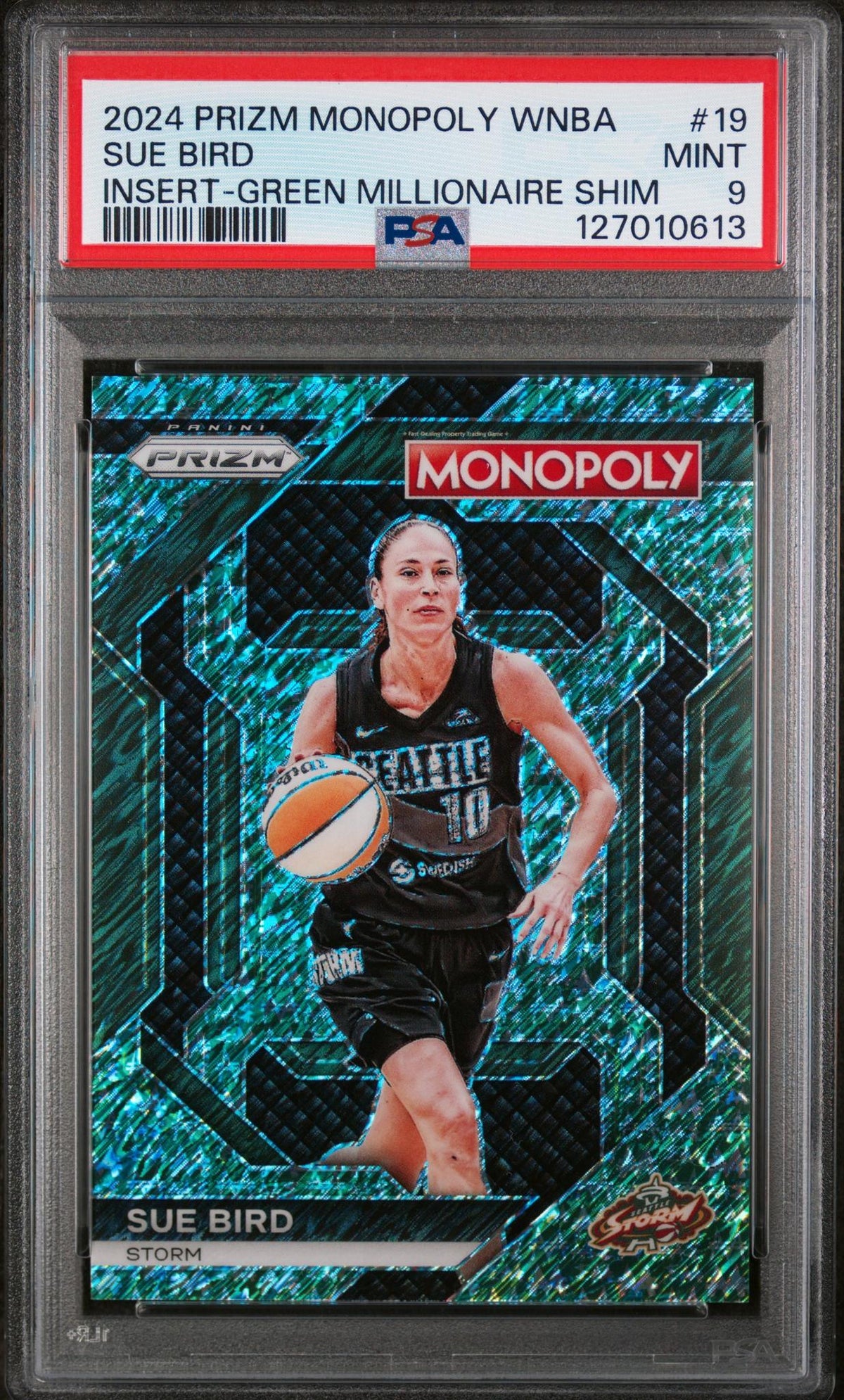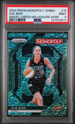 Unveiling a stellar piece from the 2024 Panini Prizm collection, the Sue Bird Green Millionaire Shim basketball card. This limited edition gem, with a serial number of just 10/20, is as exclusive as it gets.
