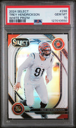 This card belongs to the 2024 Select Football card set, a sought-after series among enthusiasts and collectors alike. The key features of this card include the representation of Trey Hendrickson, its 2024 Panini Select brand, its exclusive White Prizm feature, association with the Cincinnati Bengals, and its NFL link.
