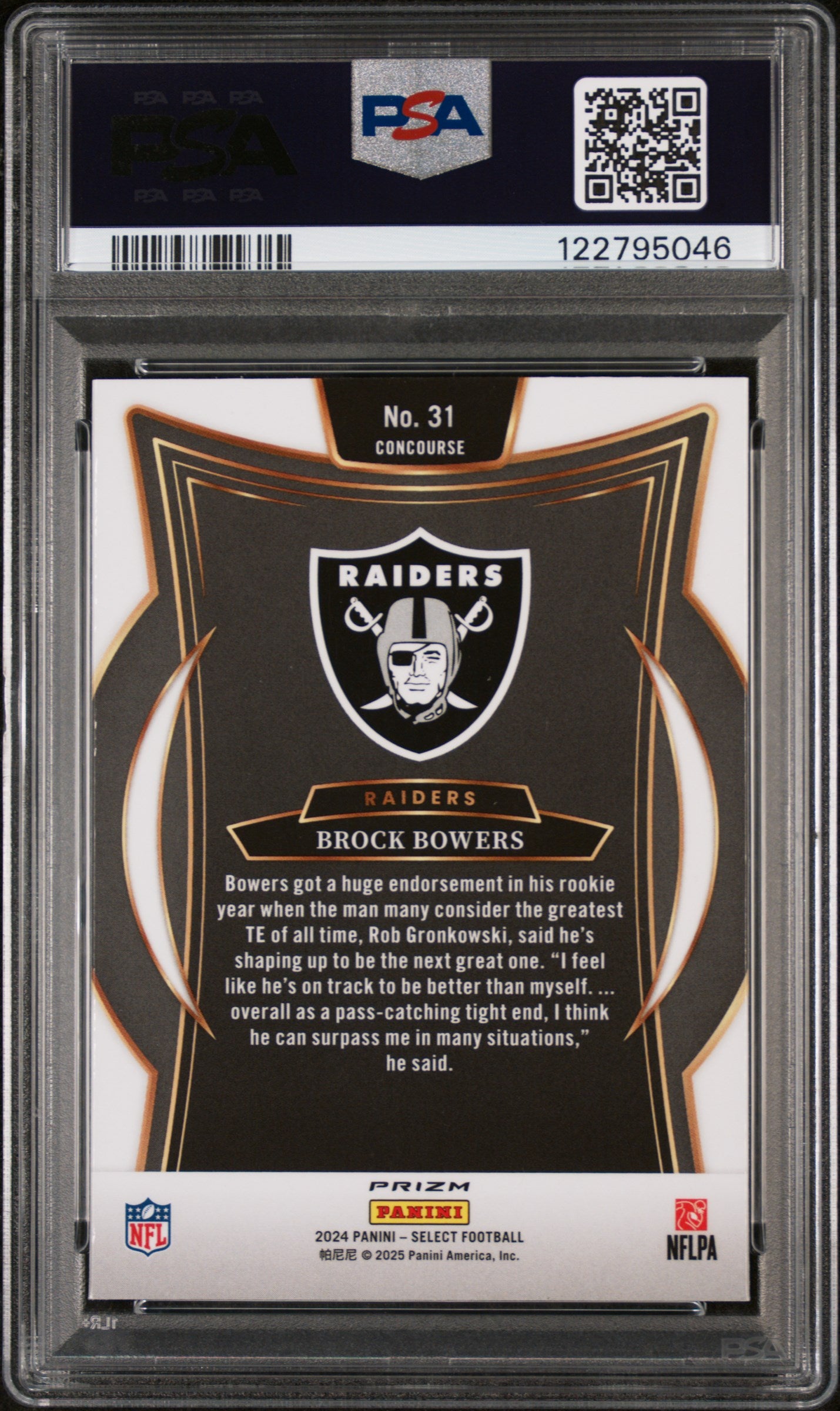 Immerse yourself in the world of sports card collecting with this absolutely stunning 2024 Select #31 Brock Bowers PSA 10 card. This gem is a part of the coveted 'Red & Blue Shock' insert set, which immediately sets it apart from the rest. Produced by the respected Panini, this card is an impressive addition to any serious collector's portfolio.