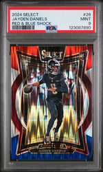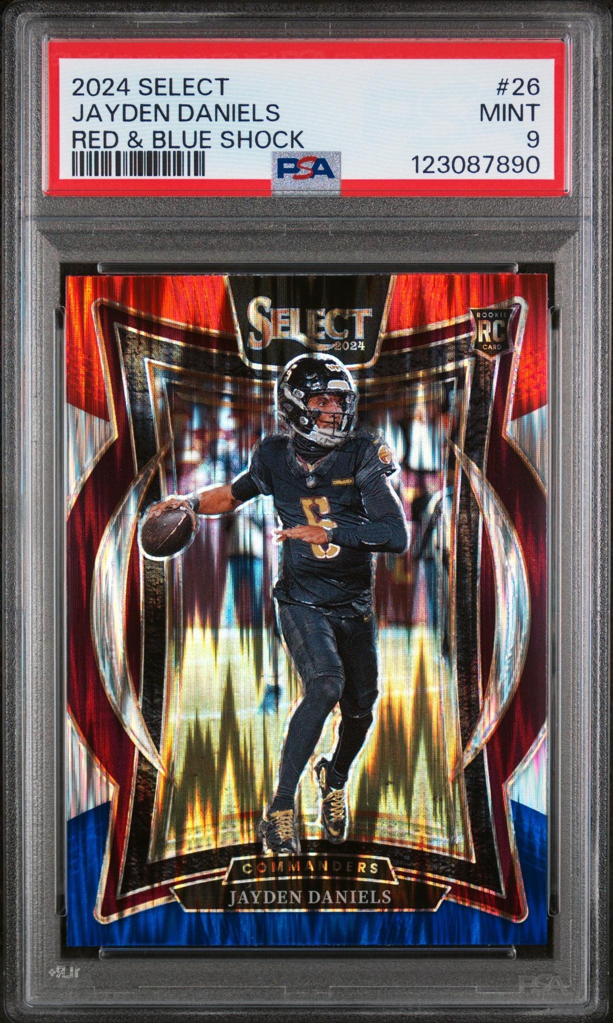 The card features the rising star, Jayden Daniels, from the Commanders team in his rookie year, increasing its value and allure. Adding an exciting twist is the unique 'Red & Blue Shock' parallel, making this card stand out in any collection.