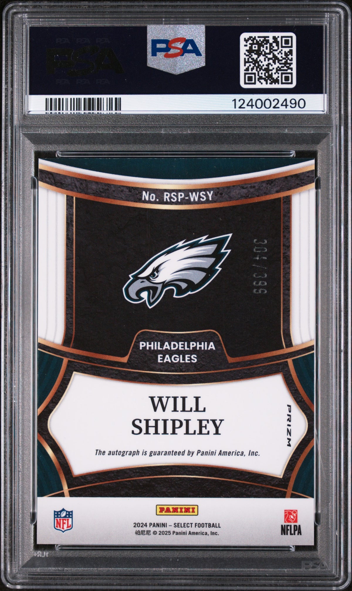 Featuring key elements like the 2024 Panini Select, Will Shipley's signature, the Philadelphia Eagles team, and the rarity of the Prizm parallel, this card is a treasure trove of unique features. Although it does not include any memorabilia, the card's intrinsic value lies in its rarity and the promising career of its featured player.