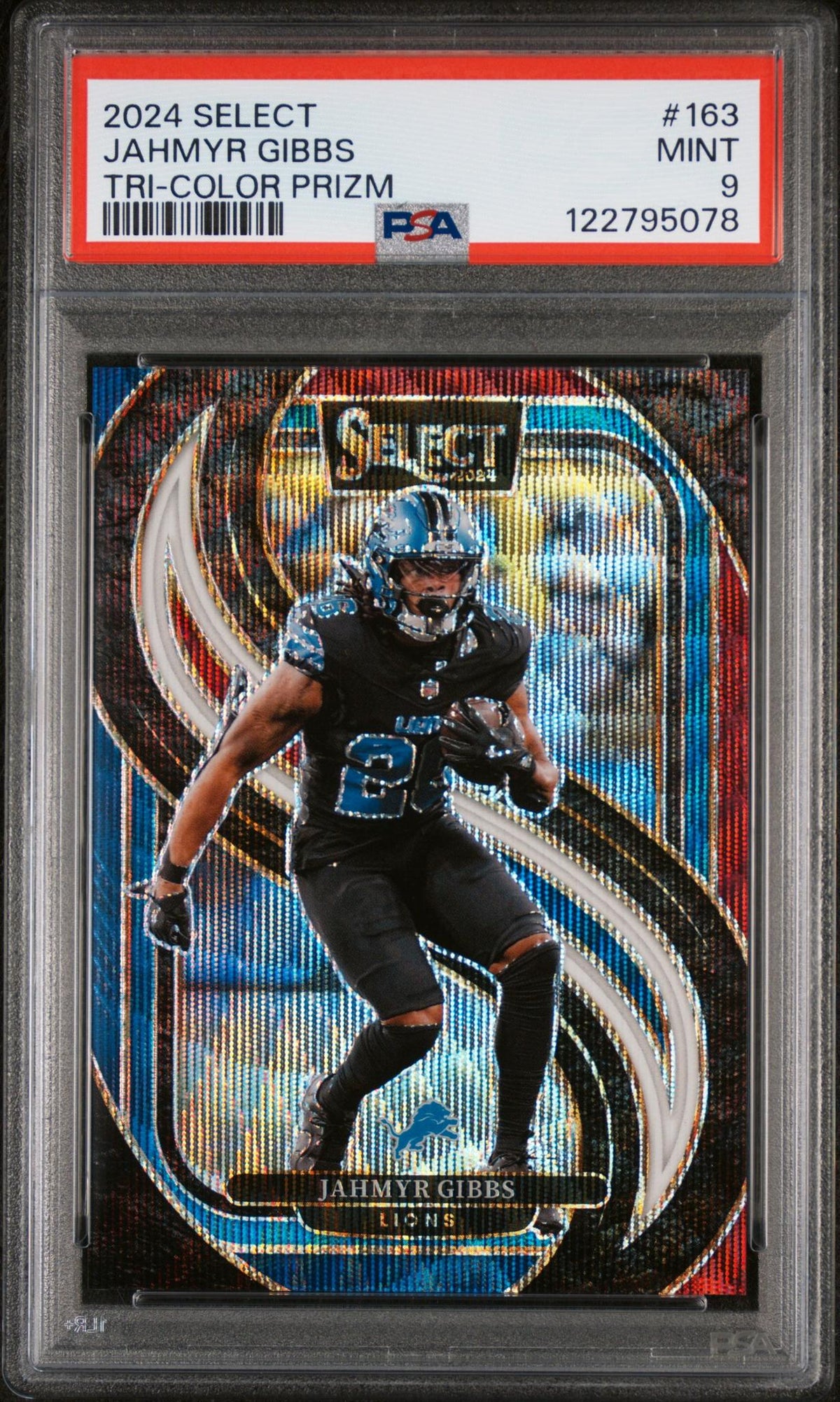 This 2024 Panini Select Jahmyr Gibbs card does not come with an autograph or memorabilia, but its high-grade, limited availability, and stunning aesthetics more than make up for it. It's not just a sports card, it's a piece of sports history, ready to enhance any collection.