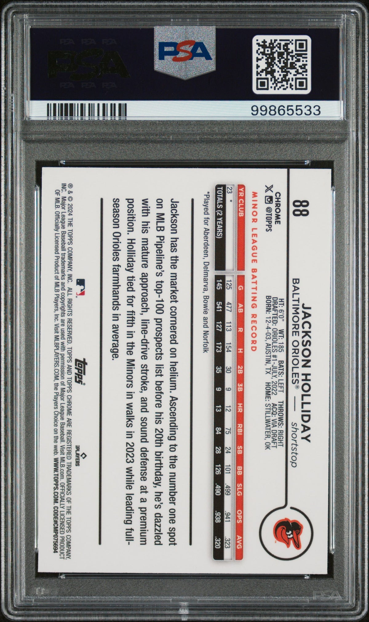 Key features of this card include Jackson Holliday's rookie status, the 2024 Topps Chrome branding, the RayWave parallel design, the Gem Mint PSA 10 grading, and the unique fact that it showcases an Orioles player in his prime.
