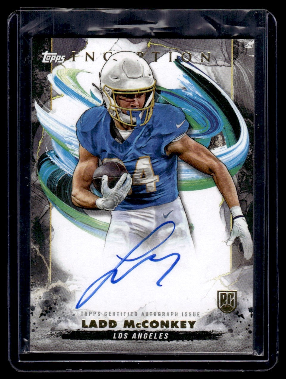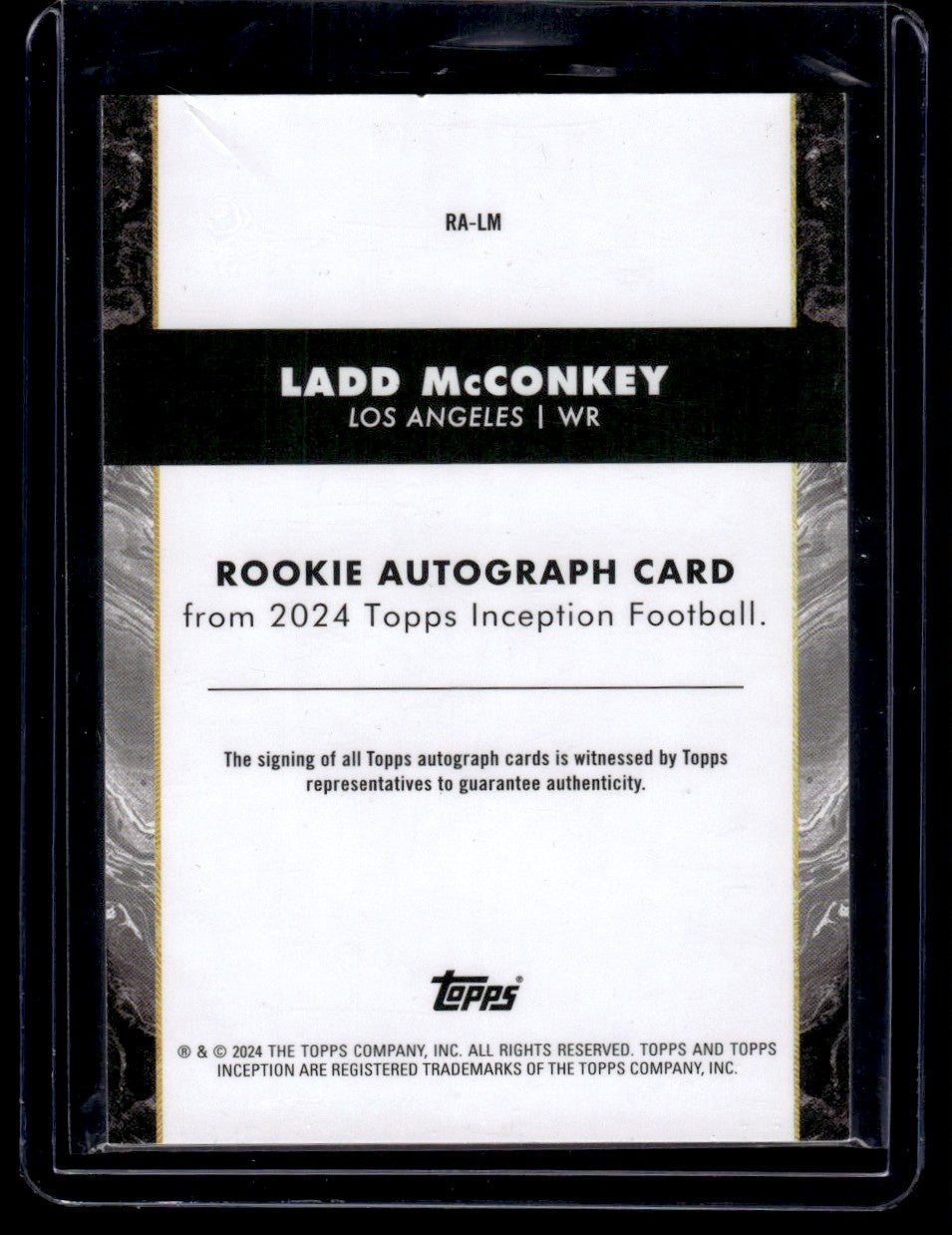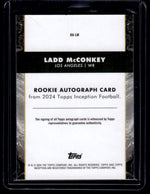 Key features include its 2024 Inception branding, the Rookie Autograph, the player Ladd McConkey, the Topps Certified Autograph, the football category, and the Los Angeles team affiliation.