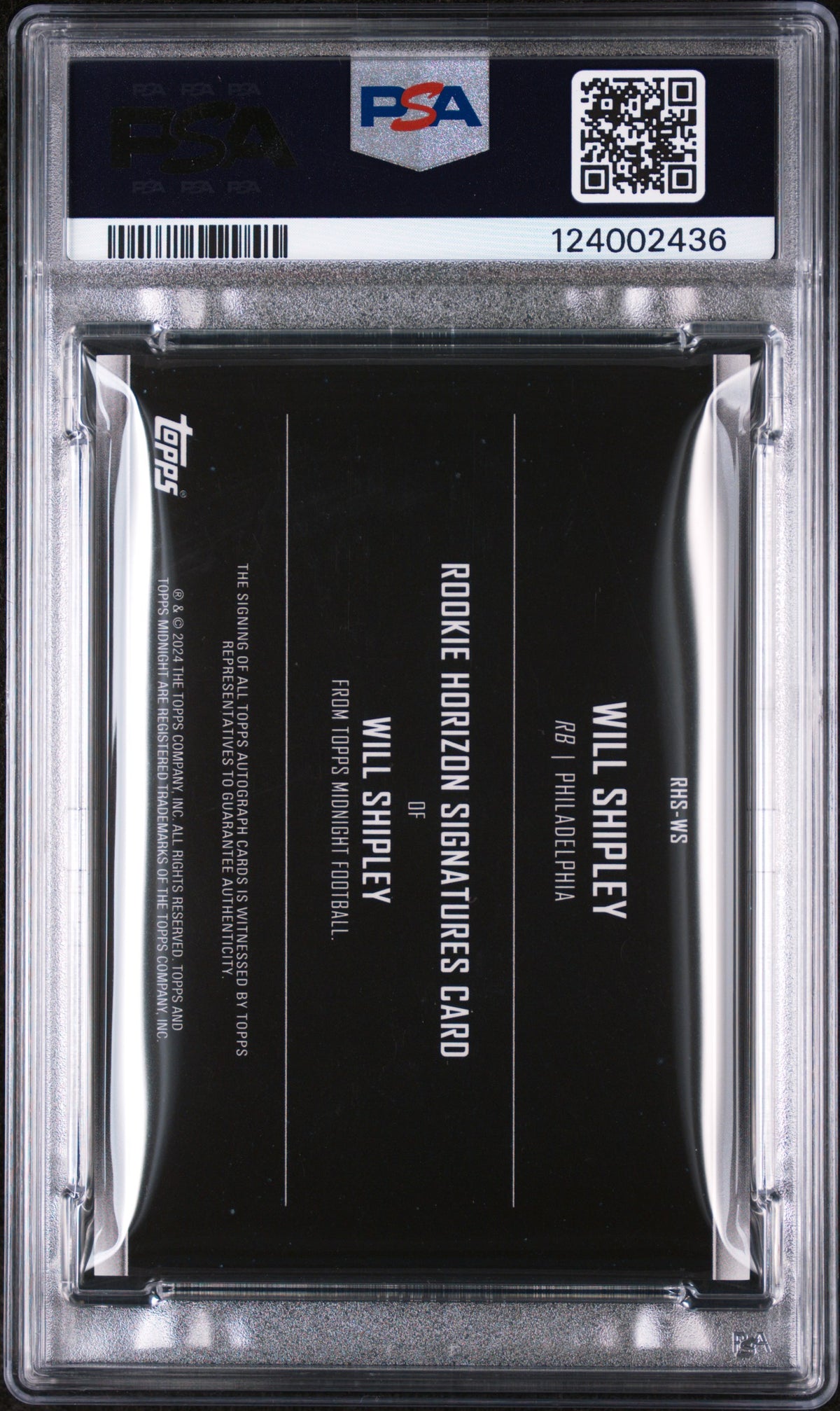 In sum, this 2024 Topps Midnight RHSWS Will Shipley card is more than just a collector's item; it's a piece of sport's history, a tribute to a rising star, and an exclusive asset that would elevate any collection. Its autograph, rarity, unique insert set, and high-grade quality make it an unmissable opportunity for any football card enthusiast. Add this card to your collection and own a piece of the legacy of this future football legend.