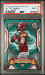 Step into the world of sports and immerse yourself in the thrill of the game with this spectacular Jayden Daniels sports card! Manufactured by the renowned Topps, this is a part of their highly sought-after 'Resurgence' series from 2024. The card stands out with its vibrant 'Teal Surge' insert set, adding a splash of color and uniqueness to your collection.