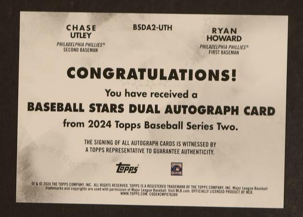 In summary, this 2024 Topps BSDA2-UTH Chase Utley, Ryan Howard Baseball Card is an absolute gem and a testament to Topps' commitment to quality and authenticity. It's a perfect treasure for any sports card collector or baseball enthusiast. Don't miss your chance to own this piece of Philadelphia Phillies history.