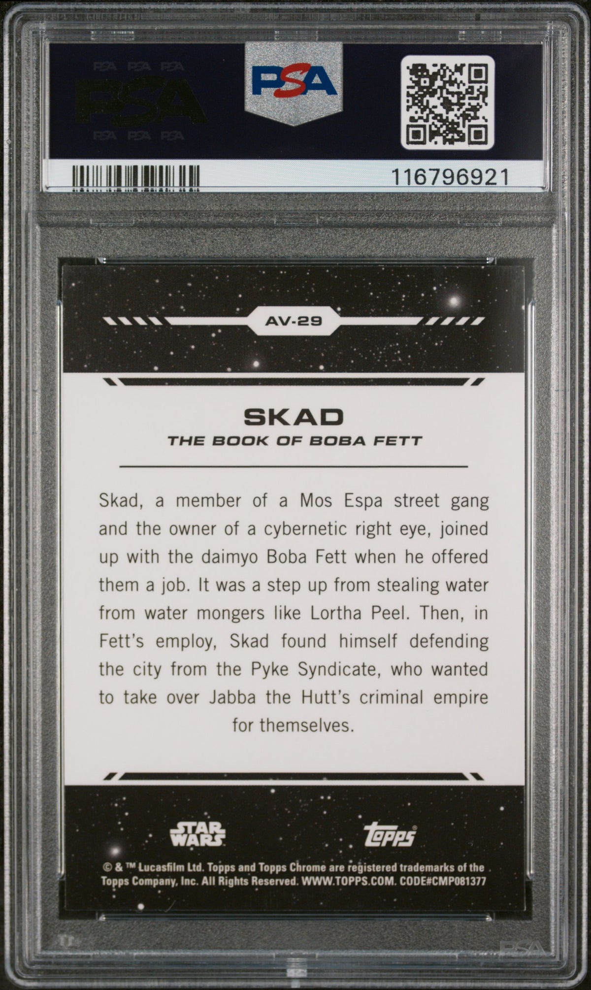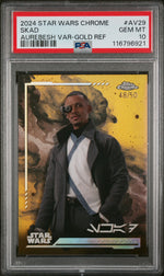 In summary, this 2024 Topps Star Wars Chrome AV29 Skad Gold card is a stunning piece of Star Wars collectible that would make an excellent addition to any collection. Its gold parallel, limited-edition status, and perfect PSA grading make it an exceptionally valuable and desirable item. Add this card to your collection and own a piece of the Star Wars galaxy!