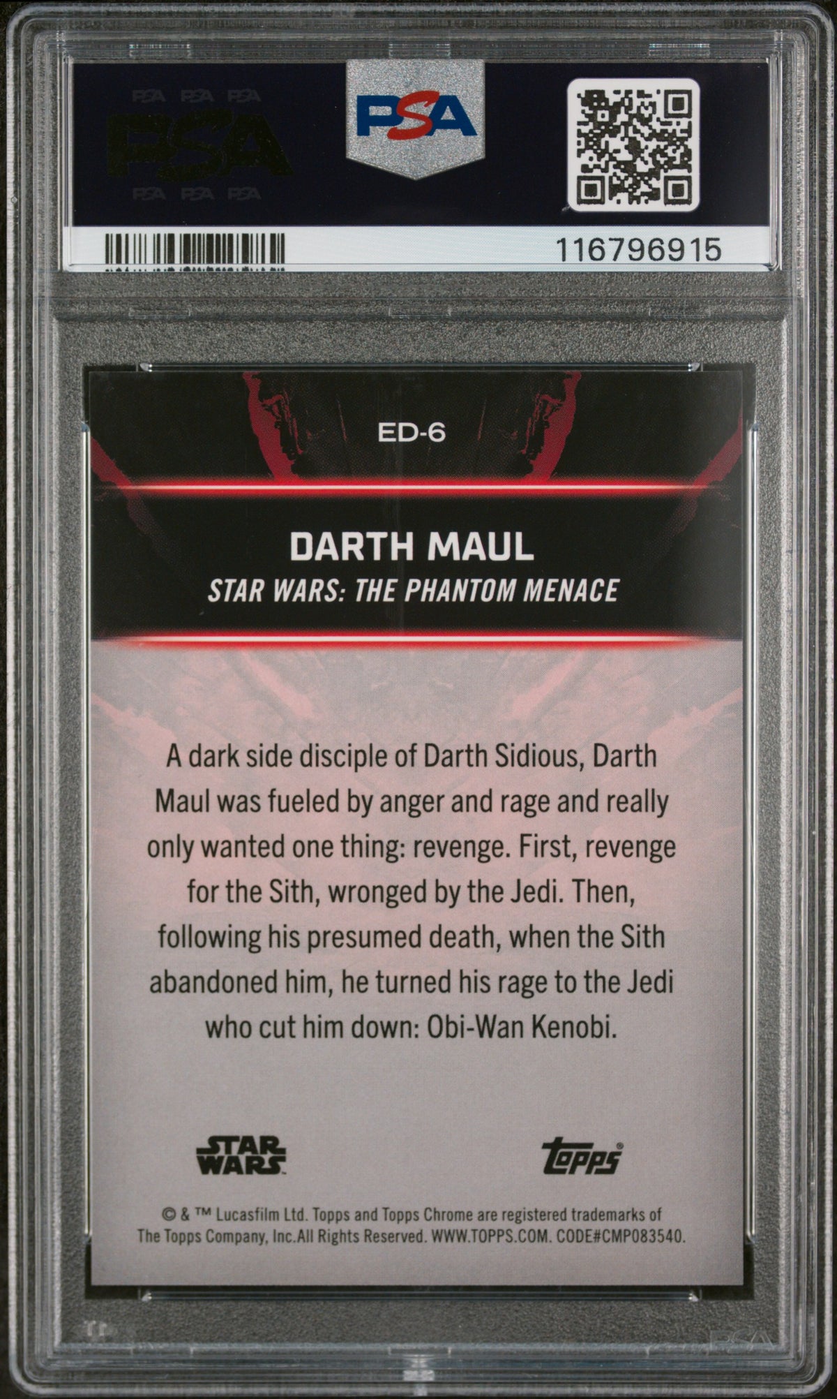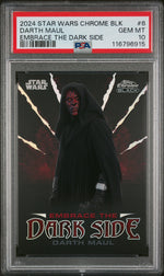 Delve into the dark side with this superb 2024 Topps Chrome #6 Darth Maul sports card. Manufactured by the acclaimed Topps, this card from the 'Embrace the Dark Side' insert set is as striking as it is rare. The card features the legendary Star Wars character, Darth Maul, brought to life in stunning glossy finish.
