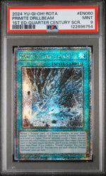 The card features the character 'Primite Drillbeam', a name that resonates in the world of Yu-Gi-Oh! Adding more credibility to this item, it has been professionally graded by PSA, a well-revered grading company, with an impressive numeric grade of 9 - a testament to its mint condition.