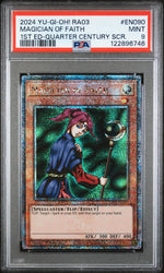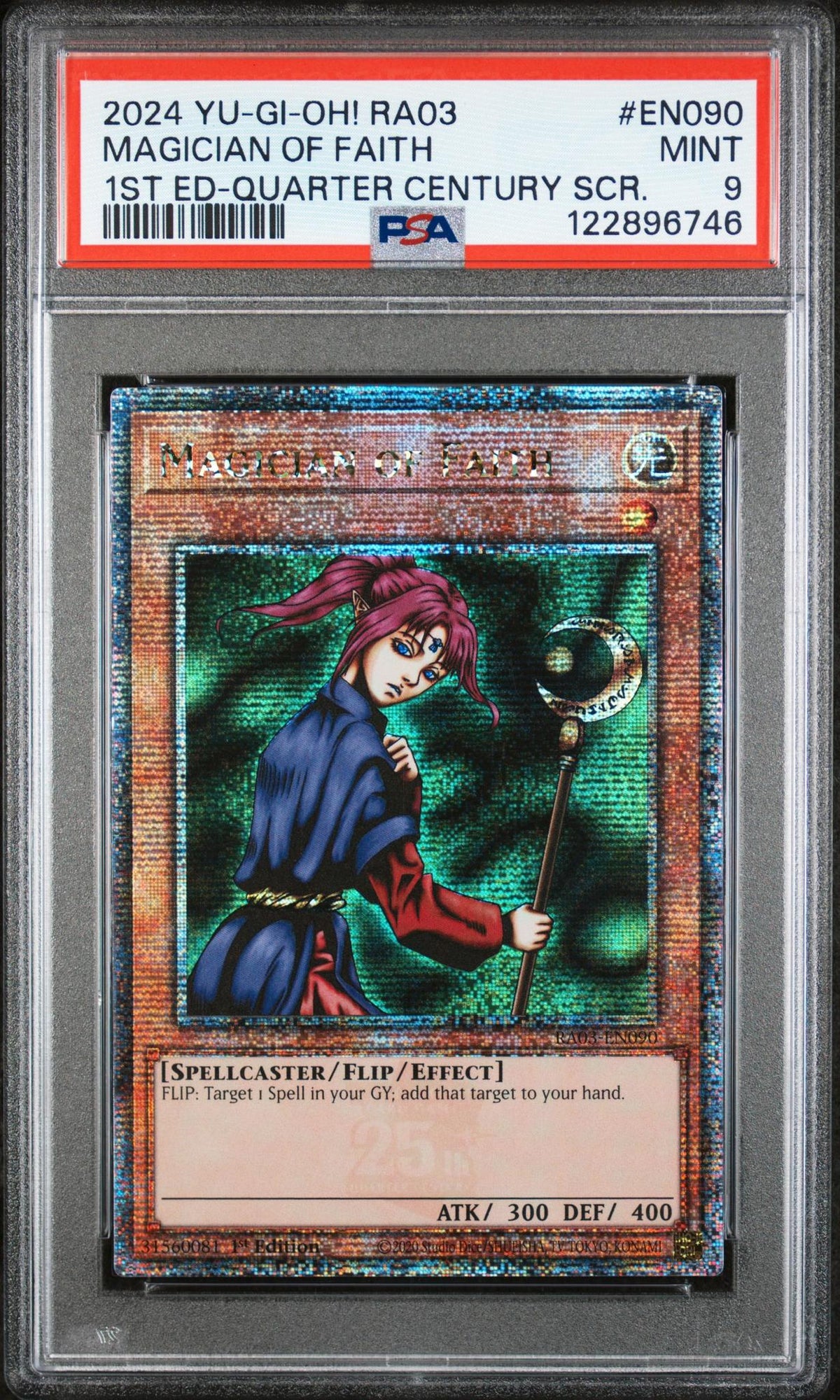 The '2024 Yu-Gi-Oh! #EN090 Magician Mint PSA 9' is a treasure trove of key features. From its 2024 release year, the prestigious Yu-Gi-Oh! brand, to its status as part of the 1st Edition Quarter Century set, every aspect of this card screams excellence. Furthermore, its 'Magician of Faith' character and 'Spellcaster' creature/monster type are truly the icing on the cake.