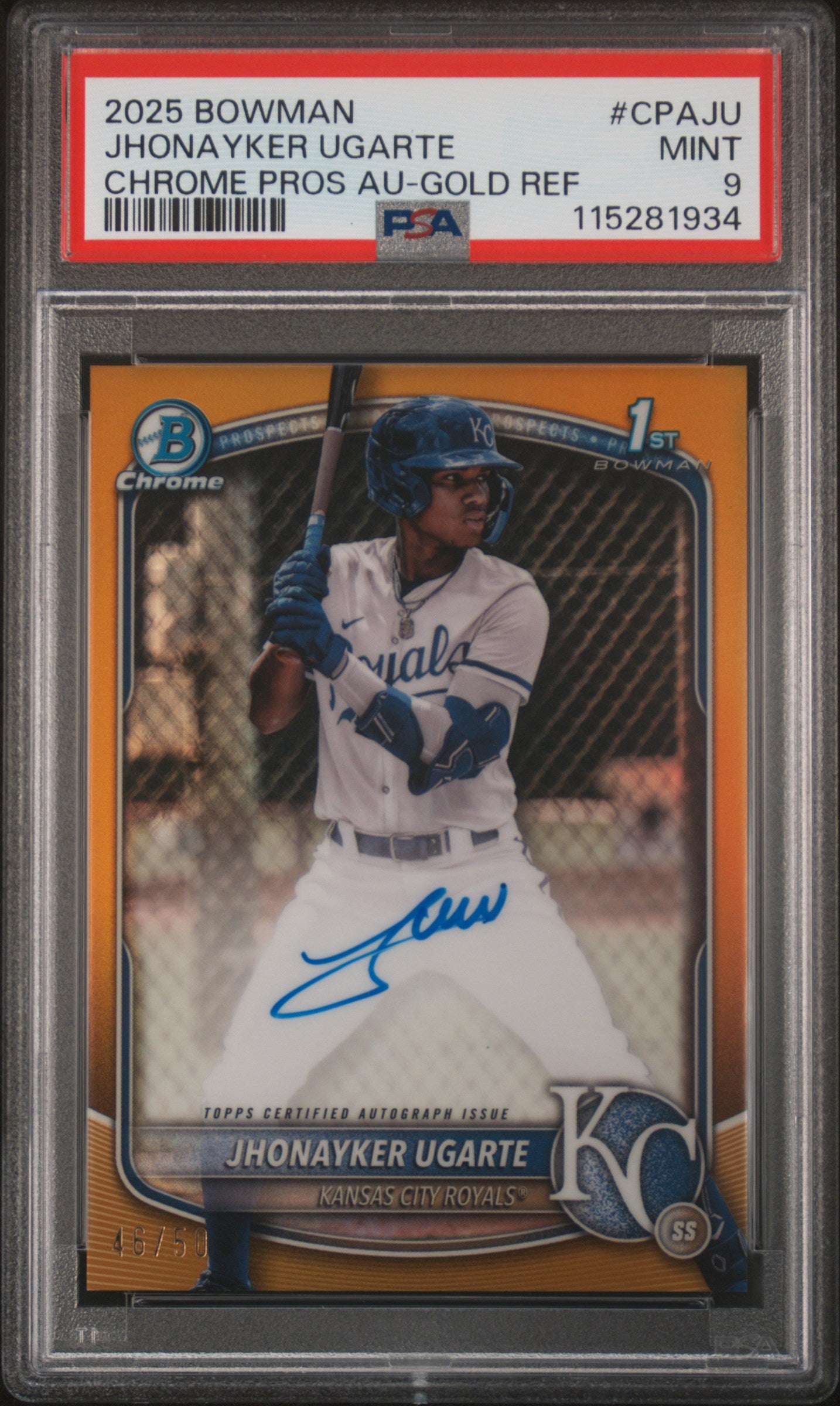 Step right up, sports card collectors! Feast your eyes on this glorious 2025 Bowman Chrome Prospects Gold Parallel card featuring the remarkable Jhonayker Ugarte of the Kansas City Royals. This card bears the distinguished Bowman brand from the renowned manufacturer, Topps, a name trusted by collectors worldwide.