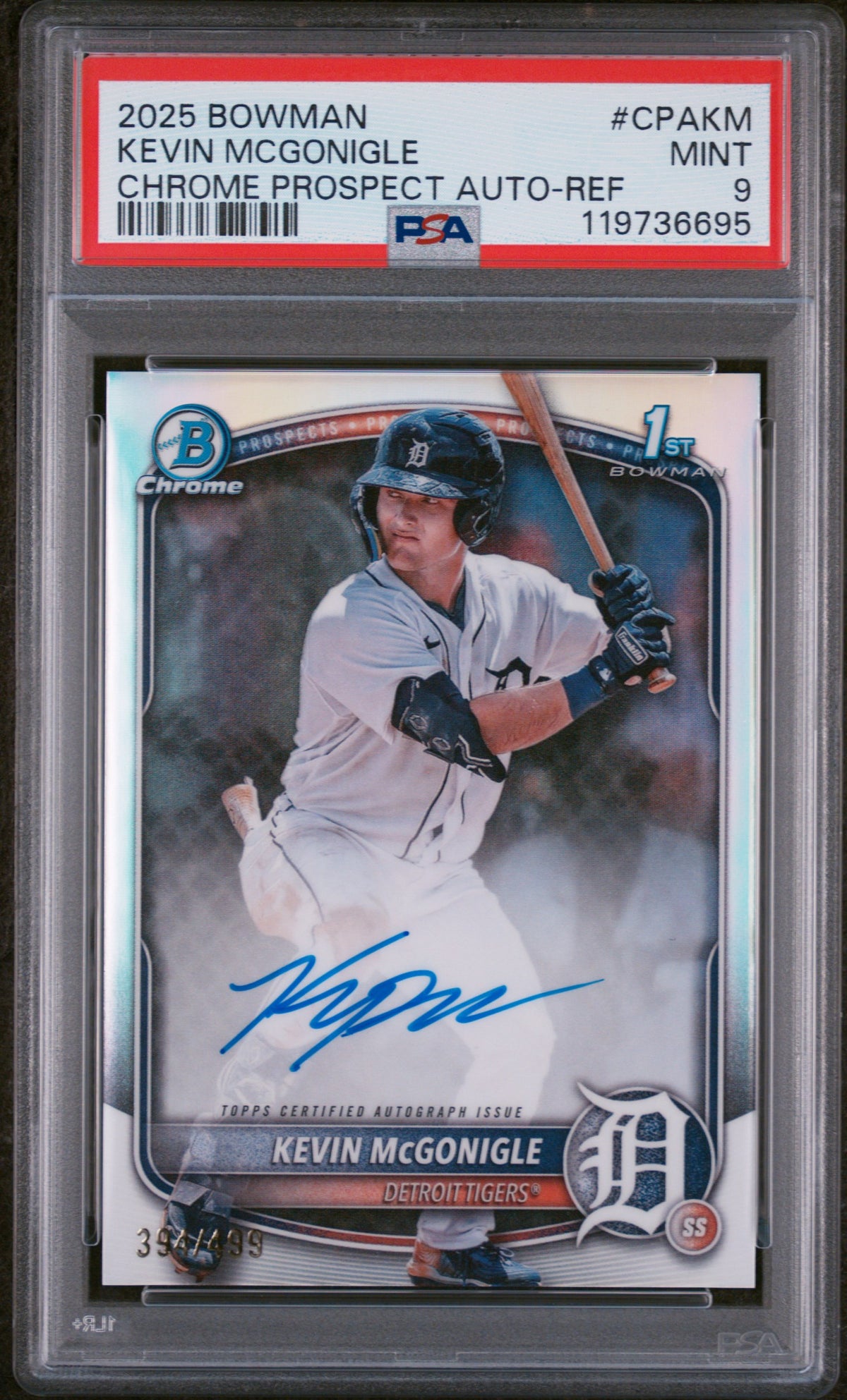 The 2025 Bowman CPAKM Kevin McGonigle PSA 9 card is a crowning jewel in the Chrome Prospect Auto-Ref Bow set, and a must-have for any serious baseball card collector. Its key features, including its limited edition status, refractor parallel, authenticated autograph, serial number, and PSA Mint 9 grading, all combine to make it a truly exceptional find.