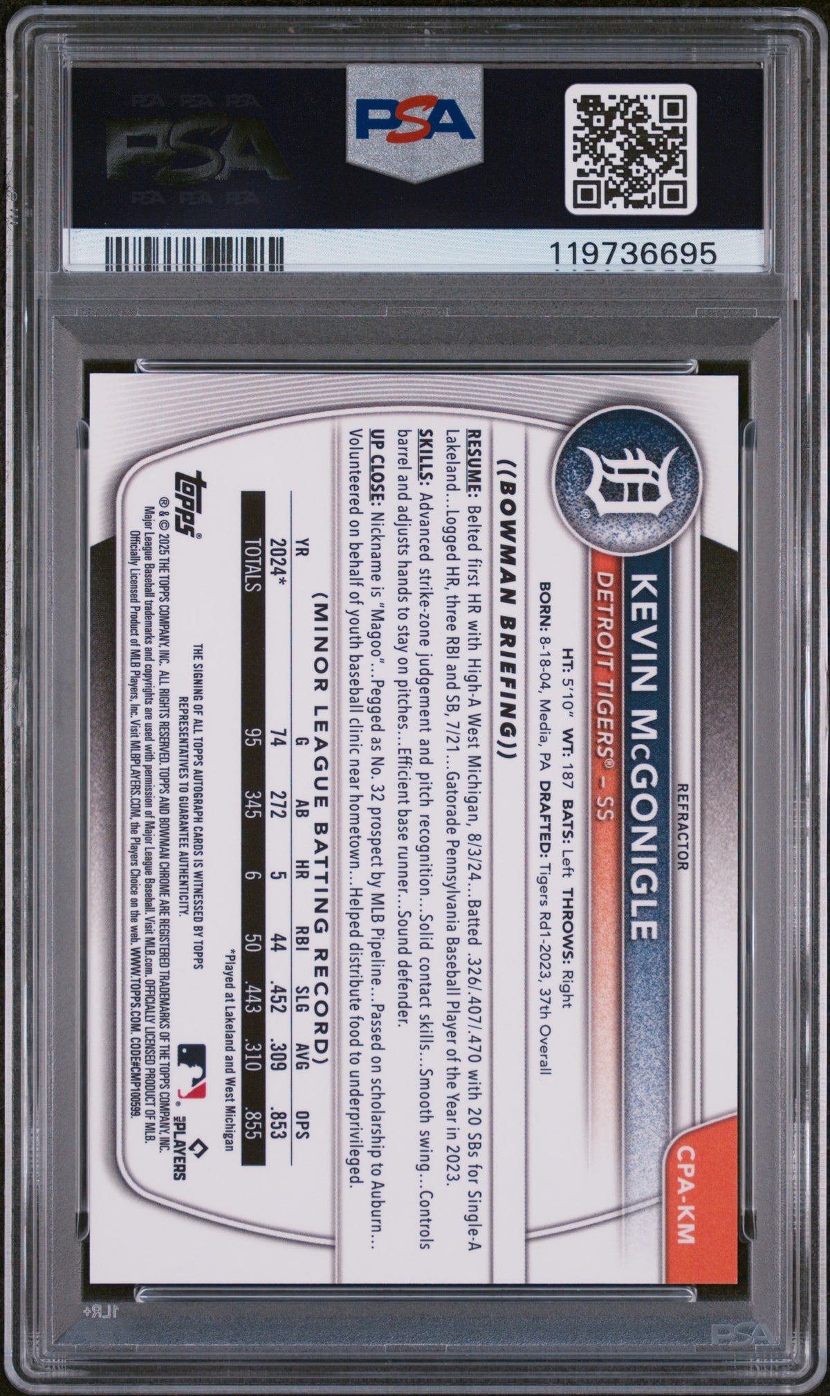 This card celebrates the early career of Kevin McGonigle, a rising star of the Detroit Tigers, making it a coveted rookie card. Adding to its allure, it features an authentic autograph from the player himself, making it a personal and unique piece of sports memorabilia.