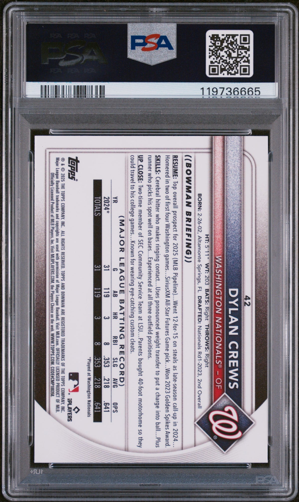 Its rarity and high grade make it a must-have for any baseball card collector, particularly those who follow the Washington Nationals or are fans of DYLAN CREWS. Whether you're a seasoned collector, a baseball enthusiast, or someone new to the hobby, this card would make a fantastic addition to any collection. Its excellent condition and unique features will surely make it a talking point among your peers. Don't miss the chance to own a piece of MLB history with this remarkable DYLAN CREWS card!