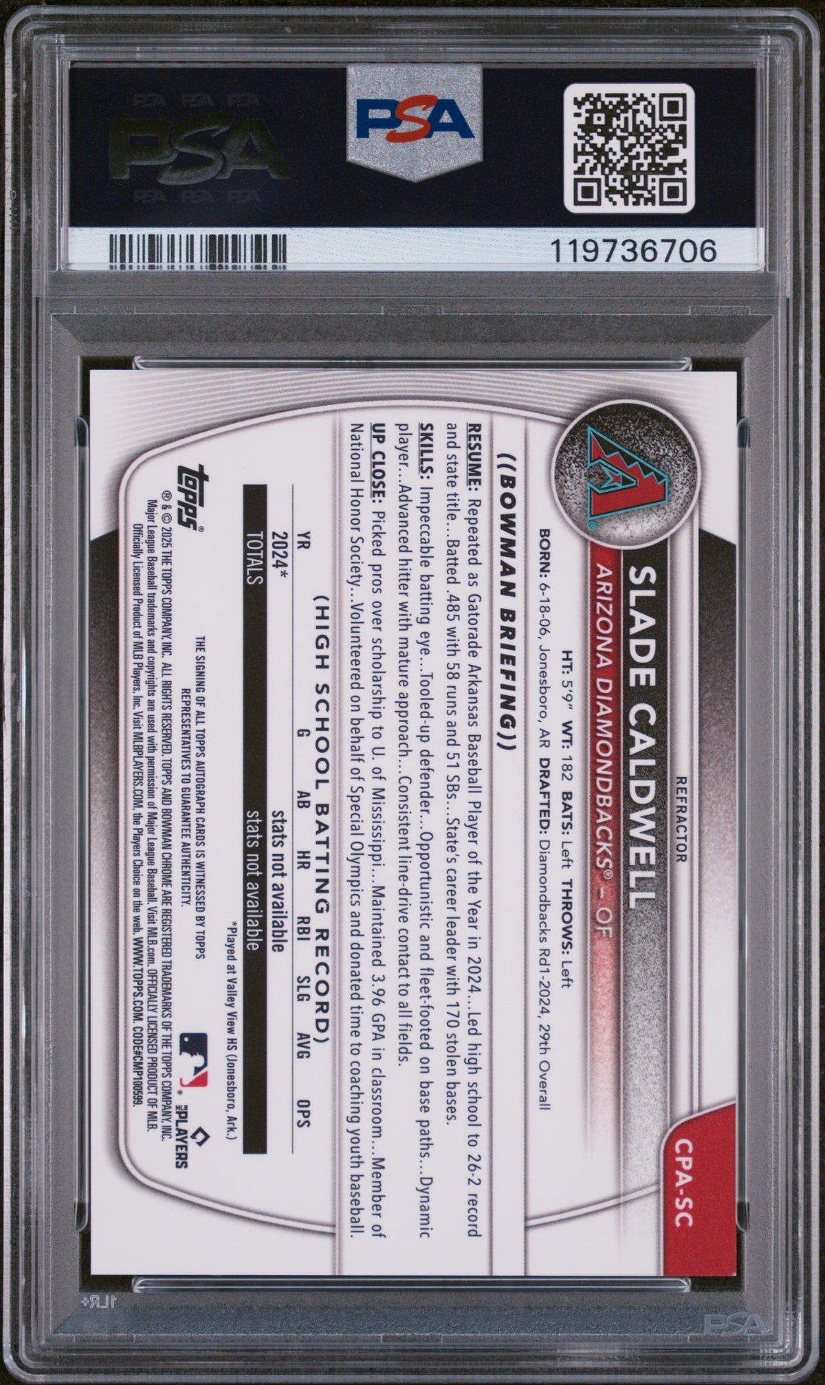 Step into the future of baseball with this exceptionally rare 2025 Bowman CPASC Slade Caldwell autographed rookie card. Manufactured by the respected Topps company, this Bowman Chrome card captures the promise and potential of Slade Caldwell, the notable Arizona Diamondbacks prospect.