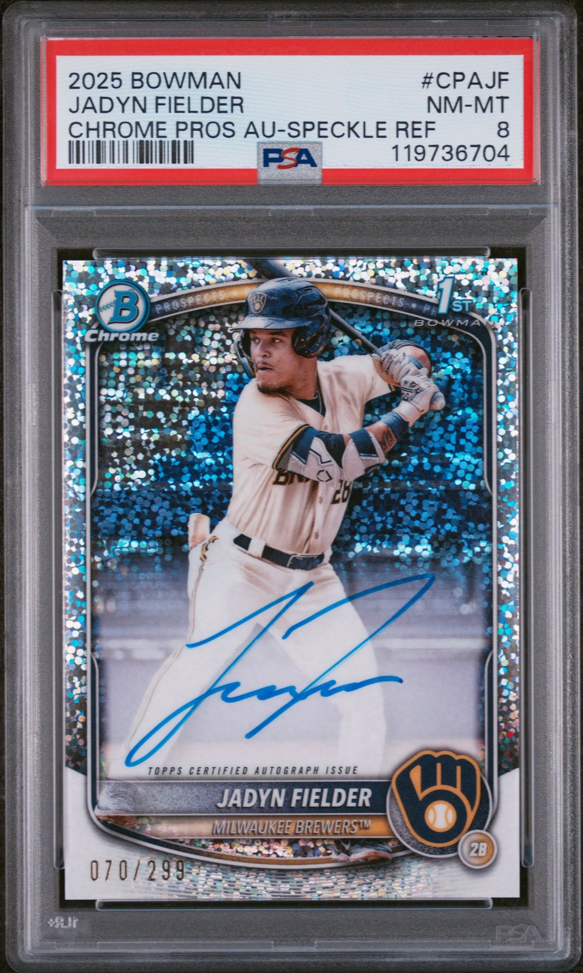Unearth the future of baseball with this exquisite 2025 Bowman CPAJF JADYN FIELDER card, a remarkable gem for any serious collector. Brought to you by the esteemed manufacturer, Topps, this card belongs to the superior 'Chrome Prospects Autograph Speckle Refractor' set, a set that is highly desired by collectors around the globe.