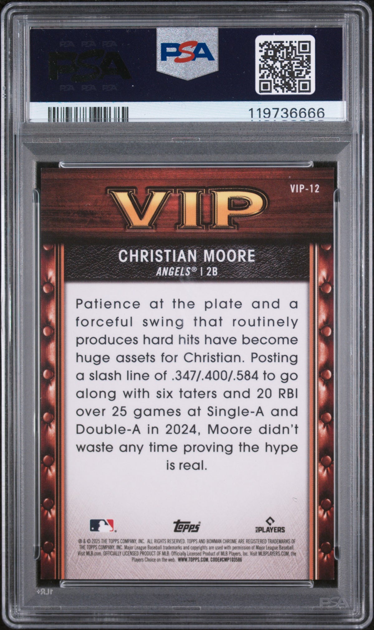 The card showcases MLB's Angel team player, Christian Moore, in all his glory. Not just a regular card, it belongs to the exclusive VIP series, ensuring its high value and desirability among enthusiasts and collectors alike. The card number VIP-12 is a testament to its exclusivity and prestige.