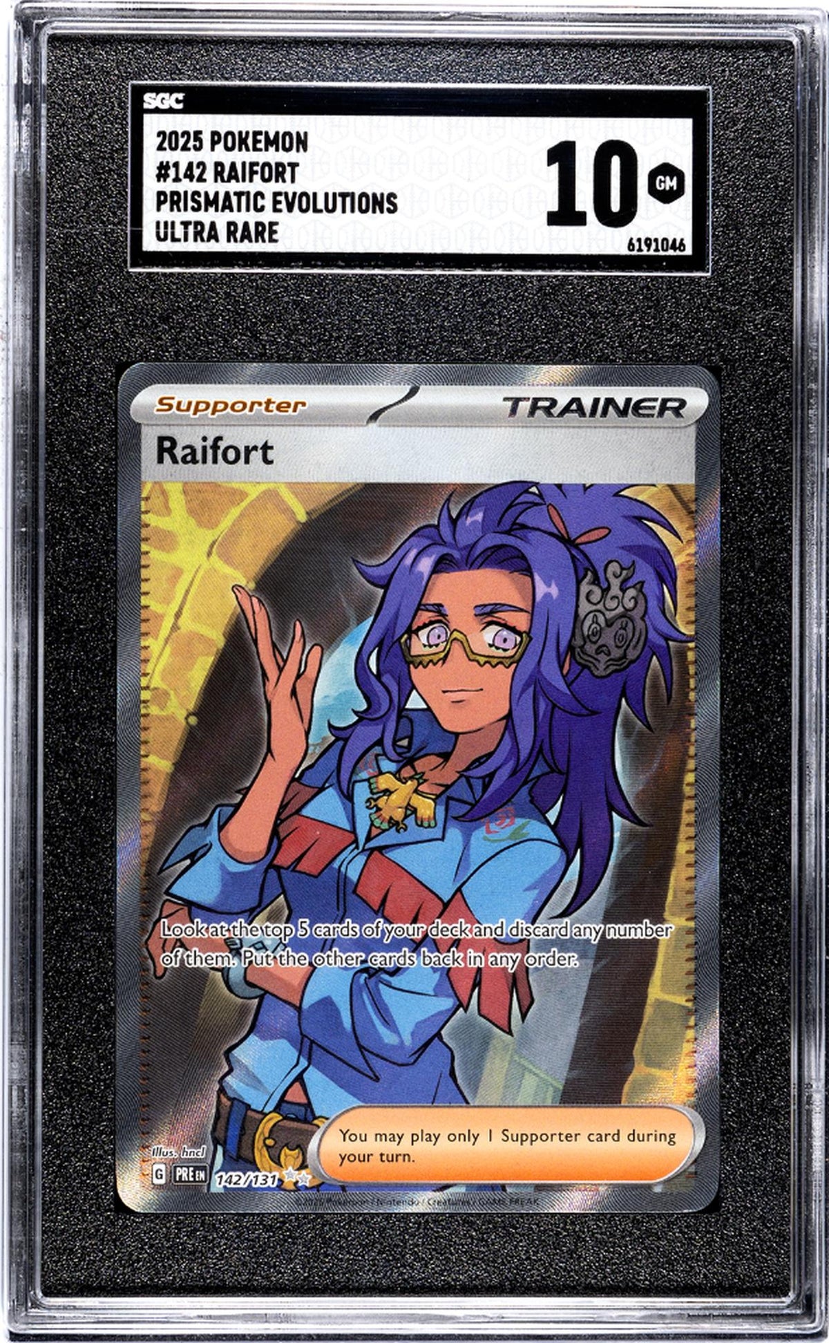 Behold the captivating allure of this Ultra Rare Gem Mint Pokemon card! Introducing the 2025 Pokemon #142 Raifort from the exclusive Prismatic Evolutions set. This card, exquisitely crafted by The Pokemon Company, is a true testament to the brand's commitment to quality and detail. Immerse yourself in the captivating journey of Raifort, one of Pokemon's unique characters. The card, a splendid piece from the Prismatic Evolutions set, is not autographed but its value and allure remain undiminished. It is an unparalleled treasure to be added to your esteemed collection. What makes this card even more remarkable is its professional grading. It has been meticulously inspected and graded by SGC, a trusted name in the industry, and has achieved a resounding score of Gem Mint 10. This rating attests to the card's pristine condition and superior quality, making it a desirable piece for both casual fans and serious collectors alike. This card, with its vivid imagery and striking details, is a true representation of the vibrant Pokemon universe. Its rarity and exceptional condition further enhance its appeal, promising a valuable addition to any collection. The card number '142/131' distinguishes it from the rest, making it a unique find. This 2025 Pokemon #142 Raifort Prismatic Evolutions card is a testament to the thrilling world of Pokemon. Its exciting features, including its Ultra Rare status and its inclusion in the Prismatic Evolutions set, make it a must-have for any avid collector. This is not simply a card; it's a piece of Pokemon history waiting to be treasured. Add this remarkable piece to your collection and experience the magic and wonder of Pokemon like never before!