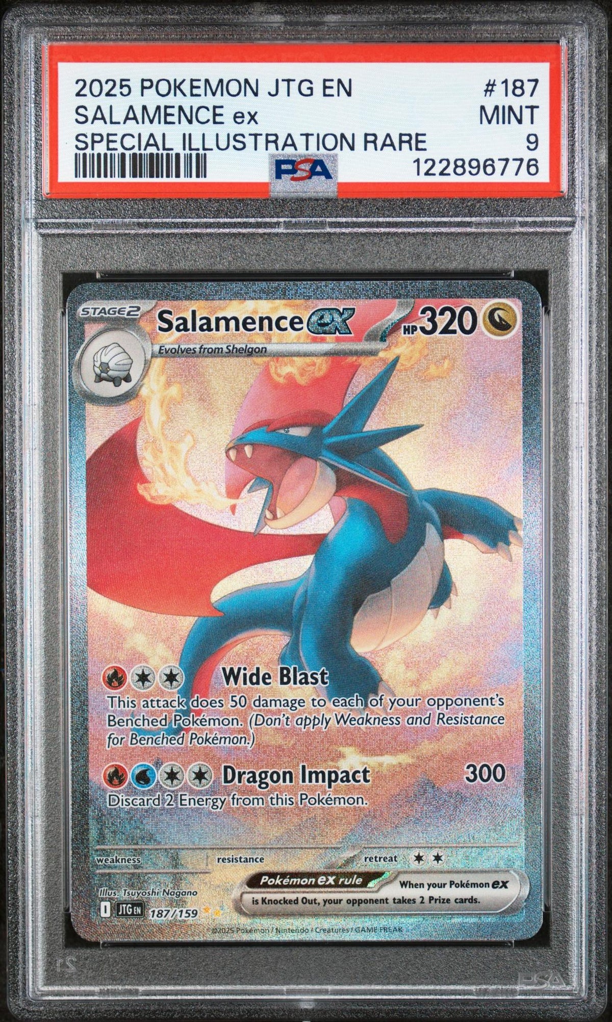 Dive into the world of Pokemon with this exceptional Salamence ex card, a true gem for any collector. Produced by renowned manufacturer Pokemon, under the prestigious JTG brand, this card hails from the year 2025, carrying the card number 187. What sets it apart is its inclusion in the 'Special Illustration Rare' insert set, a collection highly coveted by Pokemon enthusiasts worldwide.