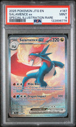 The card features the powerful character of Salamence, a Dragon-type Pokemon known for its awe-inspiring attacks and formidable presence in battles. Despite its release in 2025, this card is not a rookie card, but its value lies in its rare status. Its enchanting design and intricate details reflect the masterful artistry synonymous with Pokemon JTG sets, making it a significant piece in any collector's portfolio.