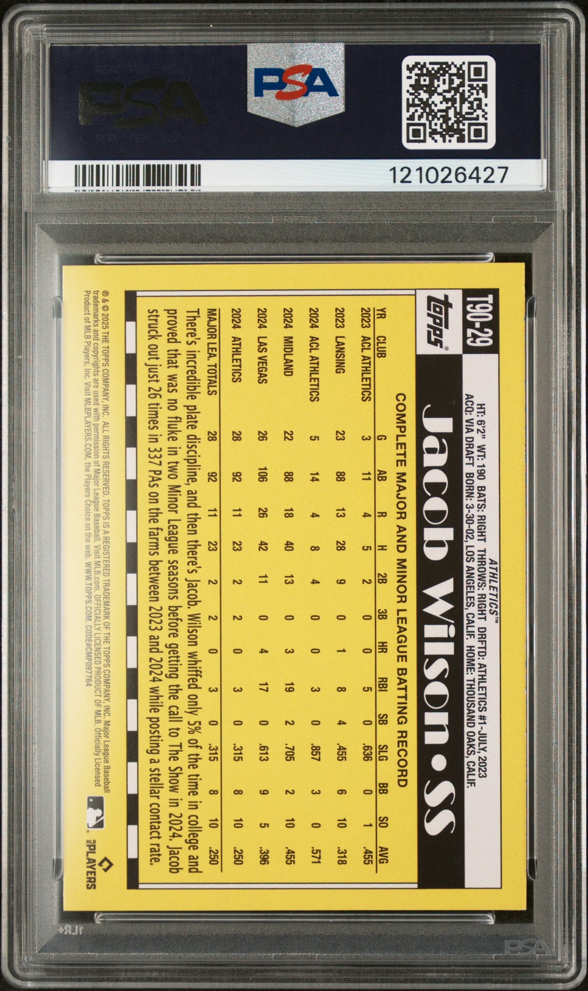 Whether you are a seasoned collector or a newcomer to the world of sports cards, this Jacob Wilson 2025 Topps T90-29 card is a valuable addition to any collection. Its incredible condition, the renown of the player, and the prestige of the Topps brand all combine to make this card a truly unique find. Don't miss out on the opportunity to own this piece of sports memorabilia, a testament to the rich history and enduring popularity of baseball.