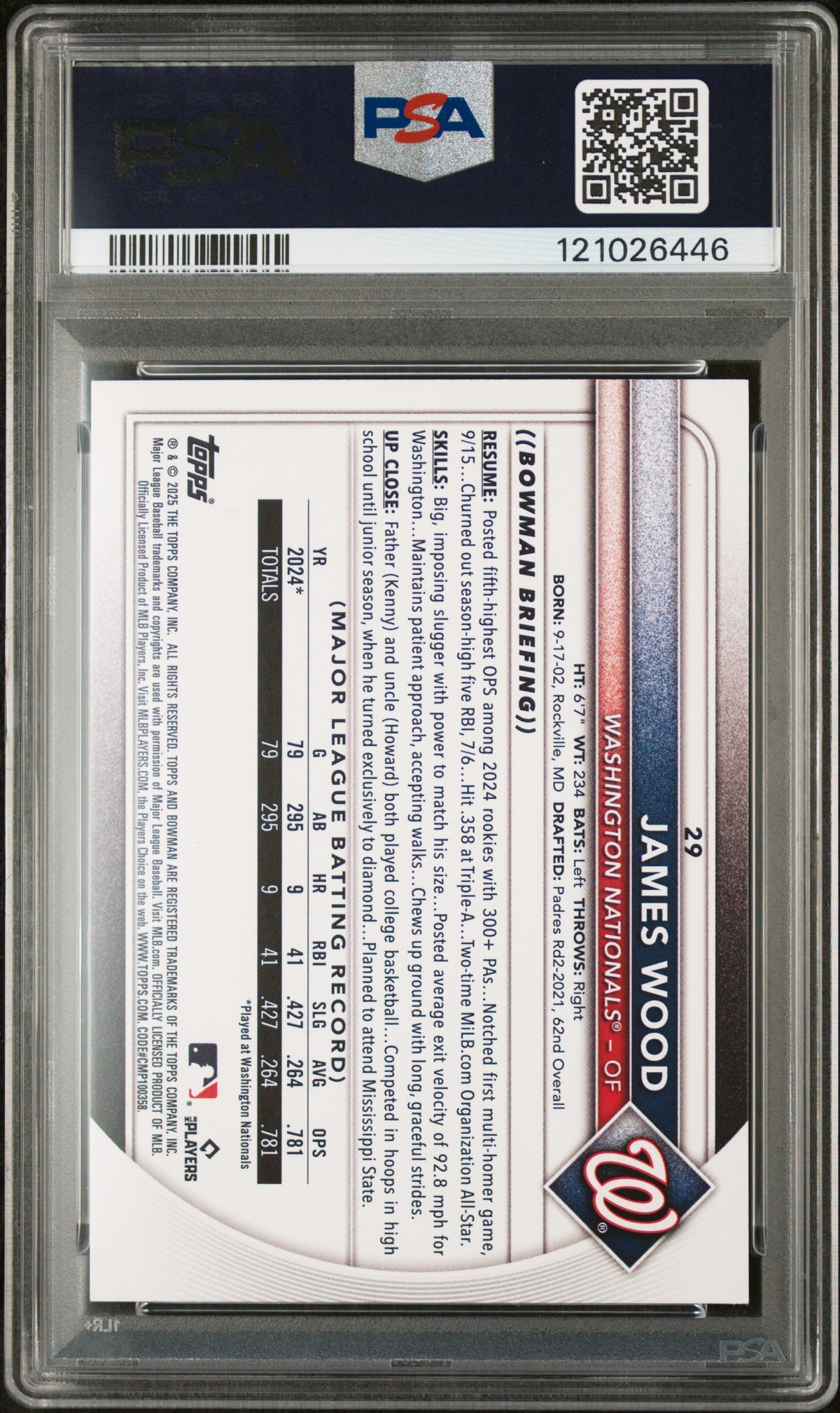 In a nutshell, this James Wood rookie card is more than just a collectible; it's a piece of sports history, a tangible testament to a promising player's journey in MLB. Its excellent condition, prestigious PSA 10 grading, and the prestige of the Topps Bowman brand all contribute to making this card a truly exceptional find. Don't miss the chance to add this gem to your collection!