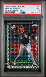 Step into the world of Major League Baseball with this highly coveted and stunning Miguel Vargas sports card from the renowned Topps Chrome 2025 set. Crafted with precision by sports card titan Topps, this card showcases the exceptional White Sox player in his prime. This isn't just any card; it's a Black Geometric parallel, a unique variant that takes the standard card design and transforms it into a piece of modern art. The sleek black geometric patterns serve as a visually striking backdrop for Vargas's image, making it a standout piece in any collection. Adding to its elite status, this card is serial numbered 09/10, placing it among a very exclusive set of cards. The rarity of this card cannot be overstated, making it a must-have for collectors who value uniqueness and exclusivity. The card's condition speaks volumes about its quality. It has been professionally graded as Mint 9 by PSA, the leading authority in card grading. This speaks volumes about its excellent state of preservation and assures potential buyers of its top-notch quality. This 2025 Topps Chrome #51 Miguel Vargas card doesn't just capture a moment in baseball history; it's a piece of art, a collectible, and an investment. Whether you're a fan of the White Sox, a Miguel Vargas admirer, or a collector looking for the next great addition to your collection, this card is the perfect choice. Its key features, including its Topps Chrome 2025 origin, Black Geometric parallel design, and serial numbered status, make it a standout choice for every sports card enthusiast. In the realm of baseball cards, the 2025 Topps Chrome #51 Miguel Vargas 09/10 card is a gem that shines brightly. Add this to your collection and own a piece of the game's rich history today.
