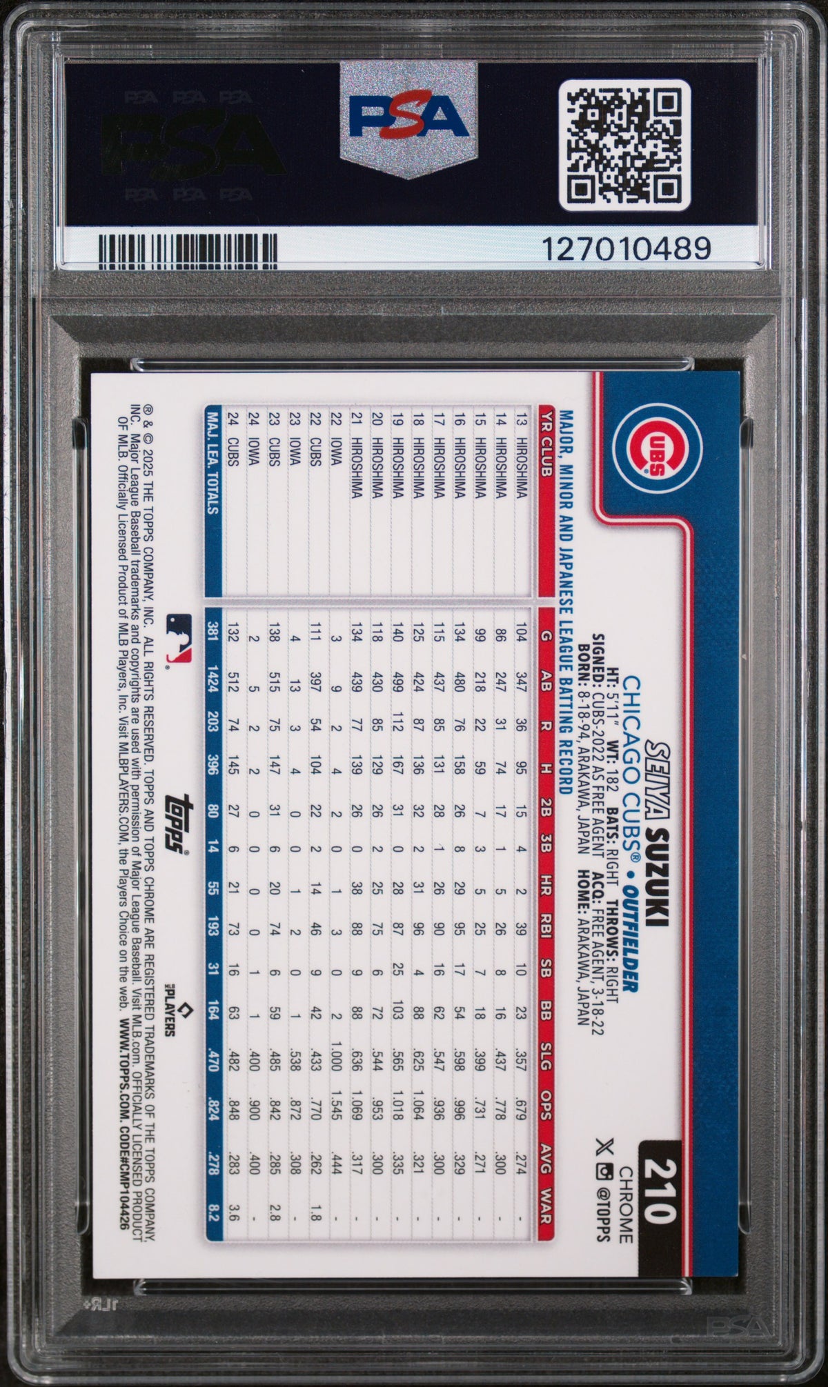 Immerse yourself in the world of Baseball card collecting with this exquisite Seiya Suzuki card from the world-renowned manufacturer, Topps. This 2025 Topps Chrome #210 card features the well-respected player from the Chicago Cubs, bringing a piece of the MLB straight to your collection. What makes this card truly stand out is its 'Red Lava' parallel, a rare feature that makes it an eye-catching addition to any collection. The card also boasts a scarce serial number of 1/5, enhancing its uniqueness and desirability among collectors and sports enthusiasts. This card isn't just visually appealing, it's been professionally graded and certified by PSA, one of the most reputable grading companies in the industry. With a high numeric grade of 9, this card is in mint condition, further amplifying its value and collectability. The 2025 Topps Chrome Red Lava set is known for its high-quality production and beautiful design, and this Seiya Suzuki card is no exception. The key features include the distinctive Red Lava parallel, PSA Mint 9 grading, and the scarce serial number. Ideal for Baseball card collectors and fans of Seiya Suzuki or the Chicago Cubs, this card is a must-have. Add to your collection or gift it to a sports enthusiast, it's guaranteed to be a standout piece! Remember, this isn't just a sports card, it's a piece of Baseball history. Own it today and let the legacy of Seiya Suzuki live on in your collection.
