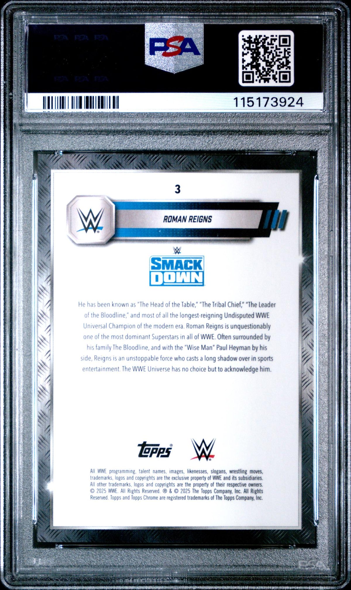 Whether you're a die-hard Roman Reigns fan, a WWE enthusiast, or a sports card collector, this 2025 Topps Chrome card is a must-have addition to your collection. Its key features include the illustrious Roman Reigns, the reputable 2025 Topps Chrome brand, the distinctive 'Purple Geometric' parallel, the limited serial number, and the flawless GEM MT 10 PSA grade.
