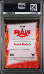 Although this card doesn't include any memorabilia, its key features more than make up for it. They include the Red Brand Chrome Autograph, the blue parallel, the PSA grade of 9, its status as a limited edition piece, and of course, the representation of Dominik Mysterio from the RAW team.