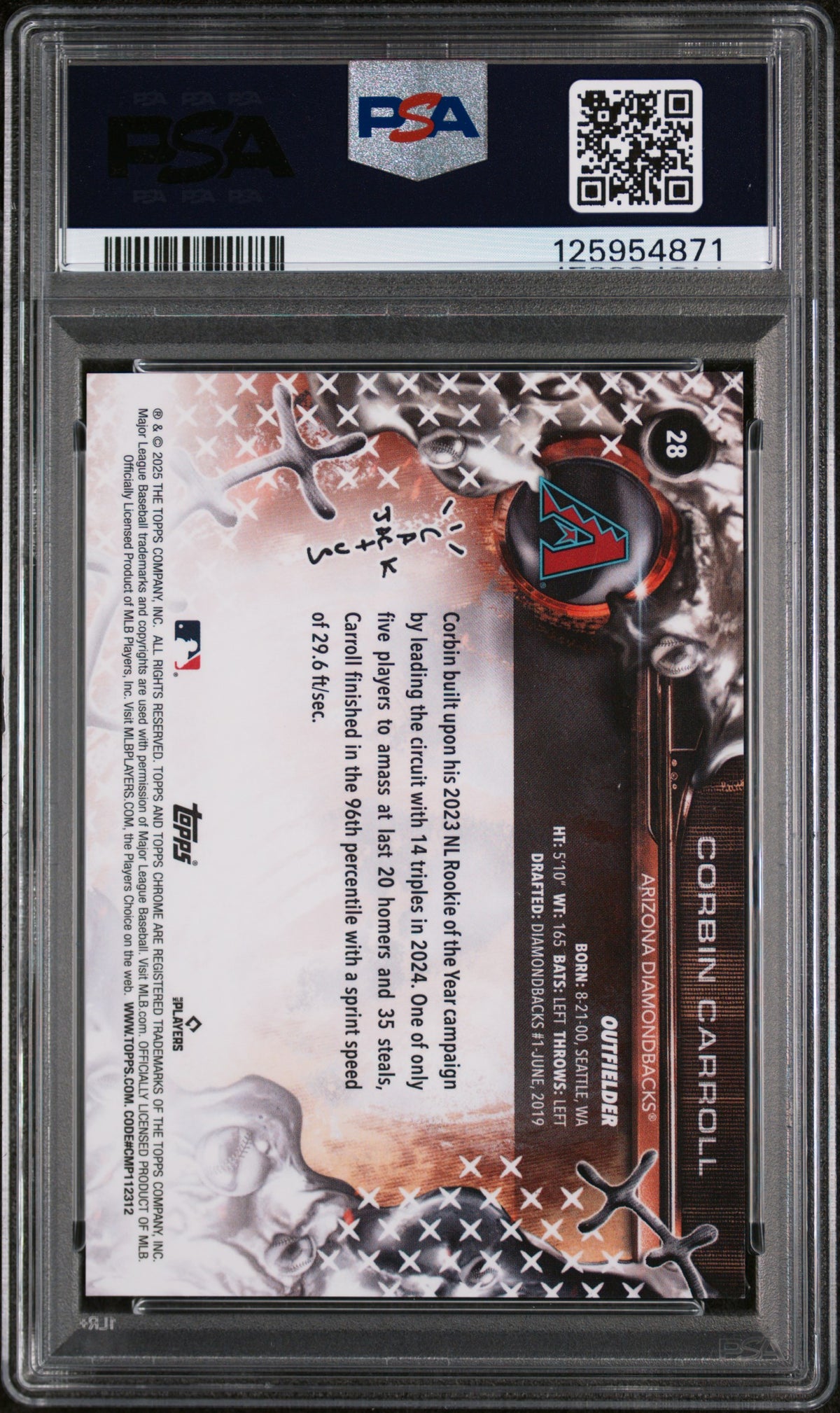 Step into the world of baseball with this stunning 2025 Topps Chrome #28 Corbin Carroll card! Manufactured by the renowned Topps, this card belongs to the exclusive 'Topps X Cactus Jack' Insert Set, making it a prized possession for any sports card collector. The card features the talented Corbin Carroll, an integral player for the Arizona Diamondbacks in Major League Baseball (MLB). The luster of the Gold Refractor finish enhances the card's aesthetic appeal, making it a standout in any collection. What makes this card truly unique is its serial number, 4/50, indicating its limited production run. The rarity and exclusivity of this card are bound to make it a coveted piece among enthusiasts and collectors alike. This card is not a rookie card, but its value is undiminished. The card's condition is professionally graded as 'Mint' by the prestigious PSA, with a numeric grade of 9, attesting to its exceptional quality and upkeep. As a testament to its authenticity, this card does not include any memorabilia and is not autographed. It stands on its own merit, with its key features being the Gold Refractor finish, Topps X Cactus Jack series, representation of the Arizona Diamondbacks, and its PSA Mint 9 grading. Add this 2025 Topps Chrome #28 Corbin Carroll card to your collection and own a piece of baseball history! This card is not just a collector's item, but a reflection of the passion, dedication, and talent that defines the world of baseball. Don't miss the opportunity to own this stunning piece of sports memorabilia.