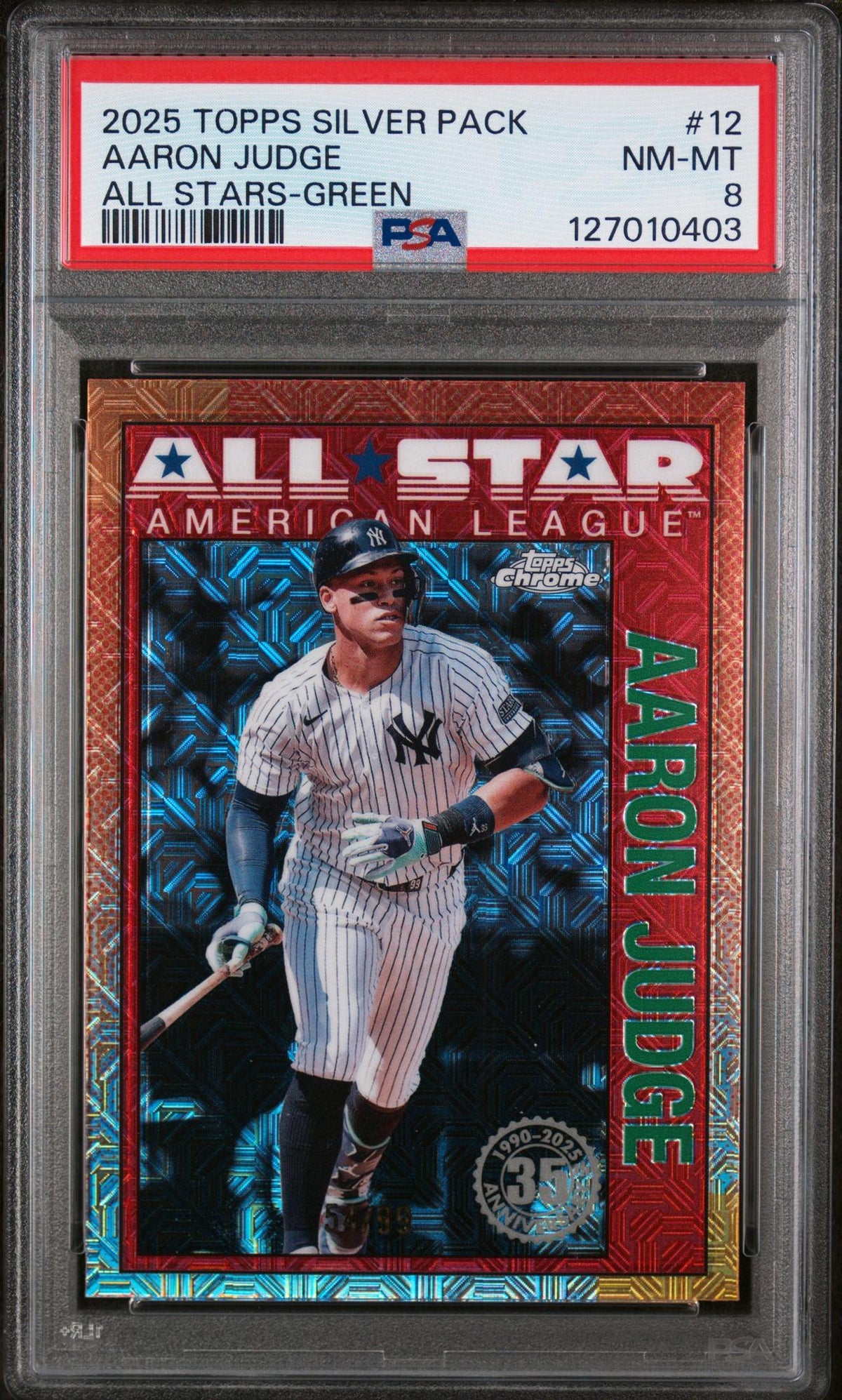 The 2025 Topps Chrome 12 Aaron Judge Green card does not include any player memorabilia, focusing instead on the player's image and stats. It is an integral piece of the Topps Silver Pack card set, a popular and sought-after set among collectors.